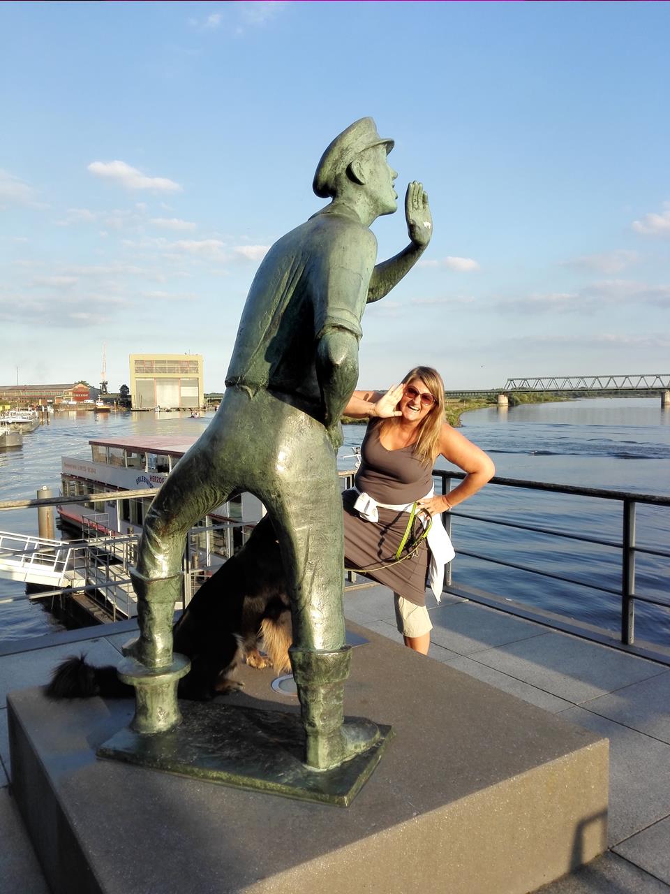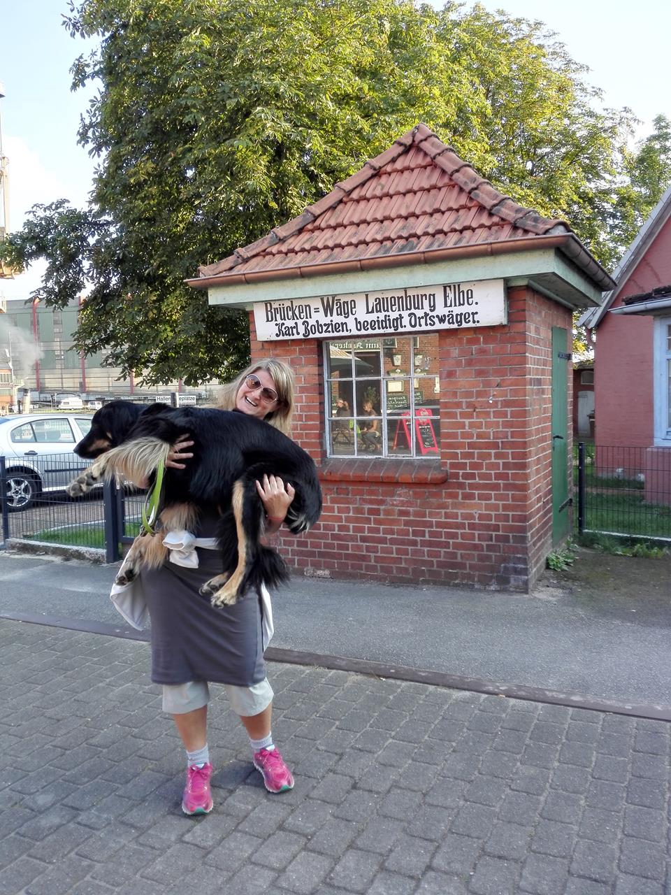 Jutta mit Doxi auf der alten Waage vor der Elbbrücke