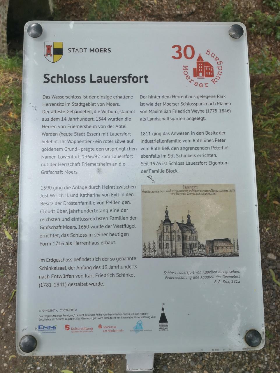 Er führt uns erst an die Autobahn A57 heran und dann am Schloss Lauersfort vorbei, einem ehemaligen Wasserschloss und Rittergut, dessen ältester Gebäudeteil aus dem 14. Jahrhundert stammt.
