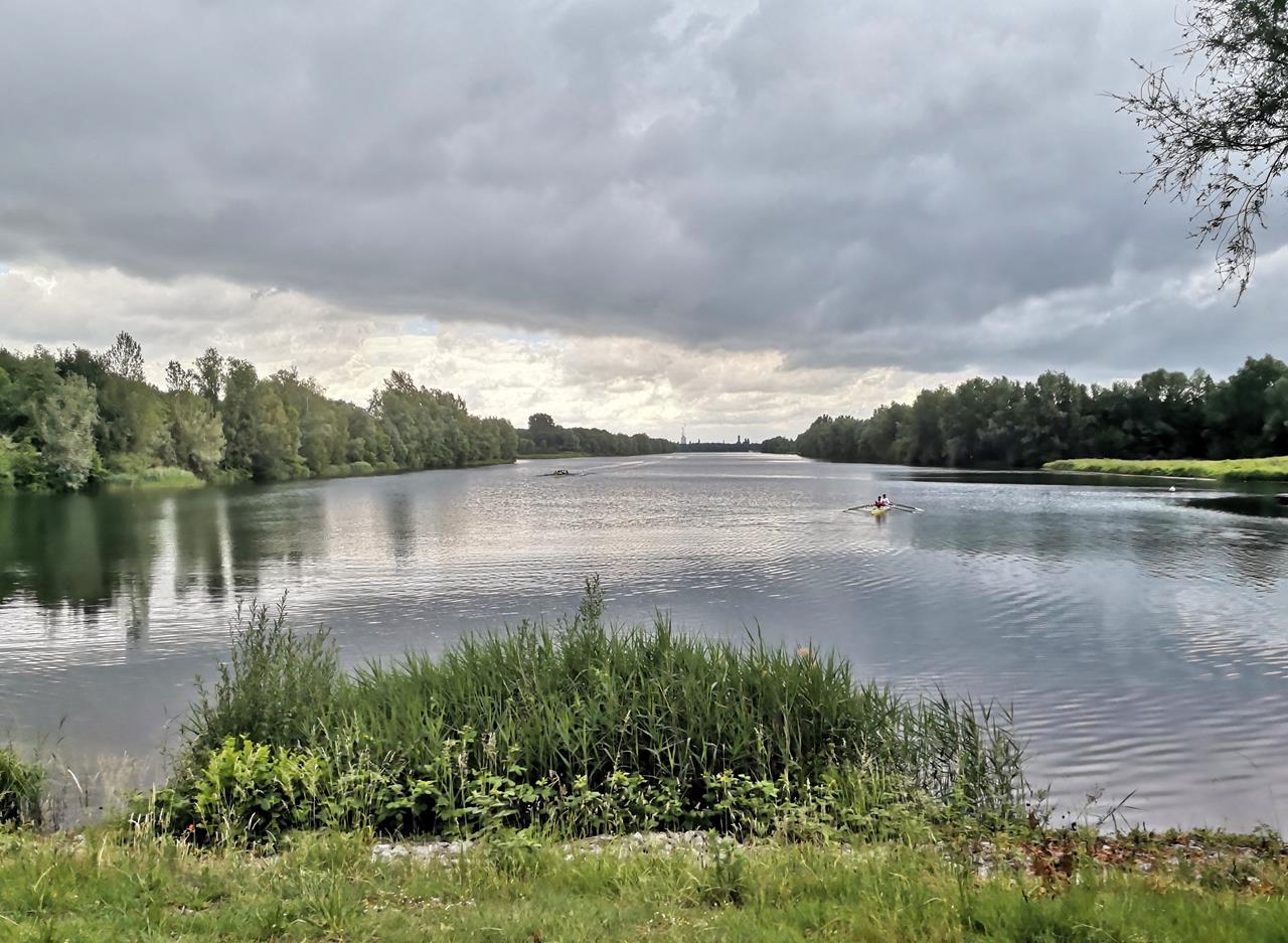 Wir starten am Elfrather See, der die Stadtgrenze zu Krefeld bildet. Der schmale und heute 2 km lange Baggersee wurde in den 1970er Jahren zur Aushebung des Kies für den Bau der angrenzenden Autobahn A57 erschlossen. Später wurde er zum Naherholungsgebiet und zur Regattastrecke ausgebaut.Als wir am Nordufer eintreffen, trainieren dort gerade zwei Ruder-Achter mit Steuerfrau. Ich bin beeindruckt, wie lang diese Boote tatsächlich sind und wie mühsam es sich für sie gestaltet, am Seeende eine 180-Grad-Kehre zu fahren.