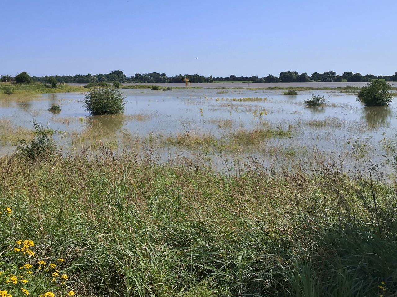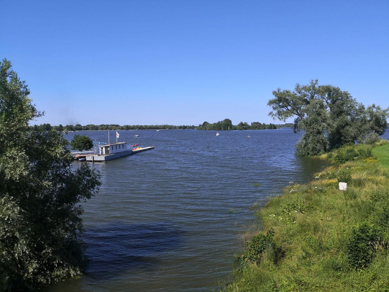 Wir laufen am Rhein entlang aus dem Ort hinaus in Richtung des Yachthafens De Bijland am großen Freizeitseee „Geldersee Port“ in einer alten Rheinschlinge. Durch seine direkte Verbindung mit dem Rhein weist der See derzeit ebenfalls einen hohen Wasserstand auf. Das Wasser schwappt bereits bis an den Fahrrad- und Fußgängerweg.