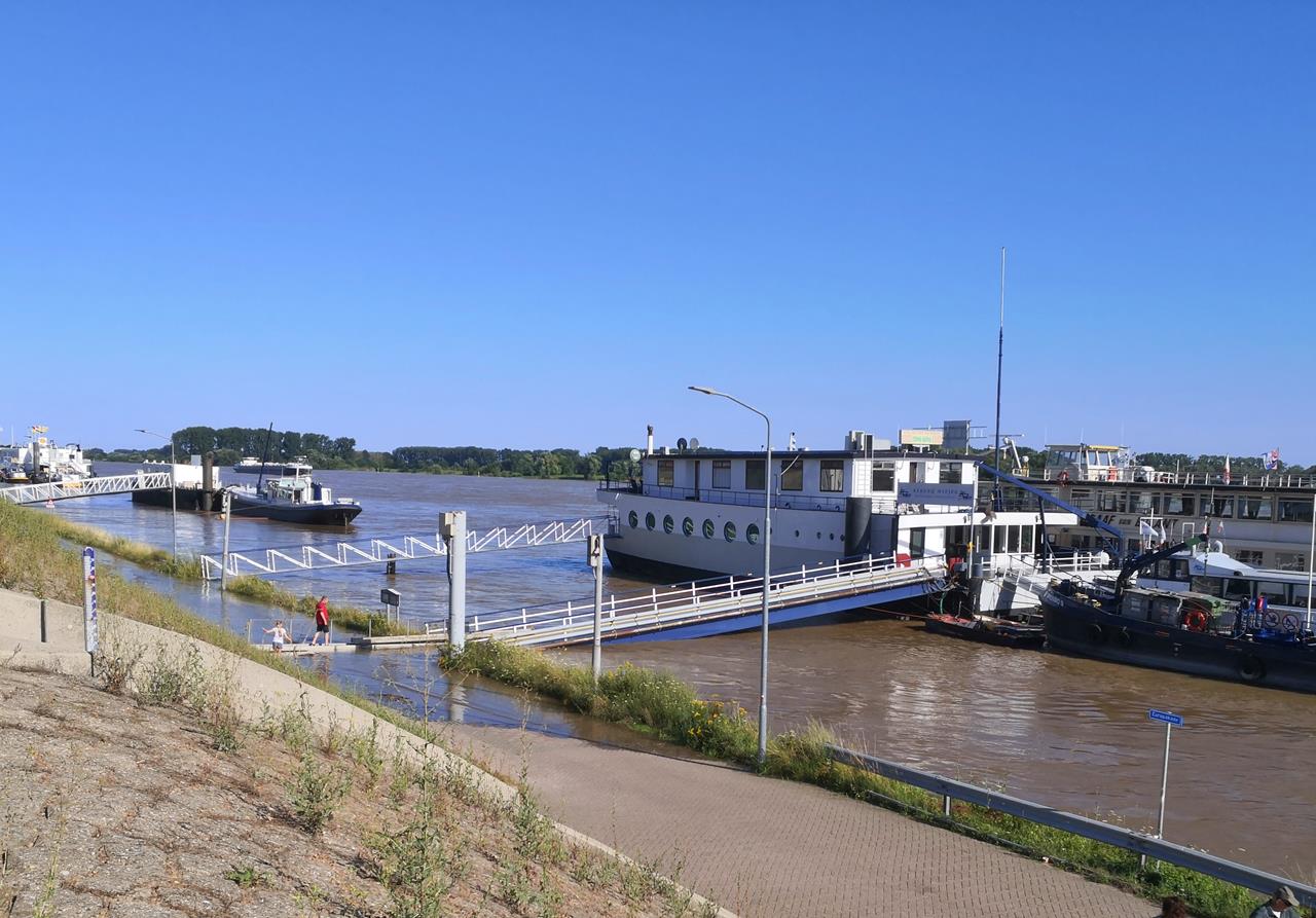 Wir starten an der Promenade „Europakade“ auf dem Rheindeich, wo die Gastronomien und Frituren jetzt am späten Samstagnachmittag gut besucht sind. Auch wir gönnen uns eine Pommes mit lecker holländischer Trüffelmayonaise.Von der Promenade fällt der Blick auf das Rheinvorland, das nach den intensiven Regenfällen im Westen und Südwesten von Deutschland bereits gut überschwemmt ist.