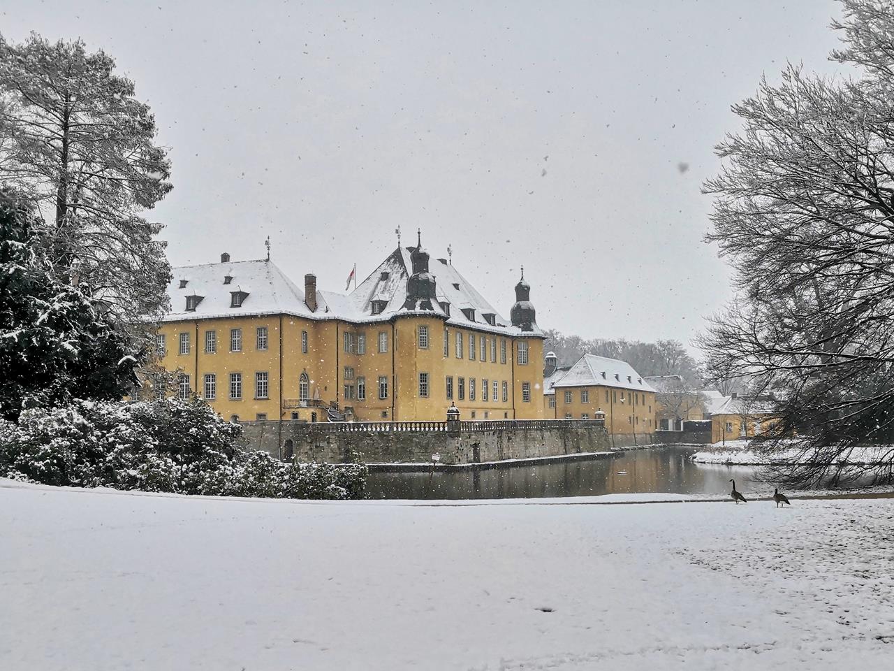 Nachdem der Berufsverkehr durch ist, mache ich mich mit Doxi auf zum Schloss Dyck, um den Park einmal in winterlichem weiß zu erleben.