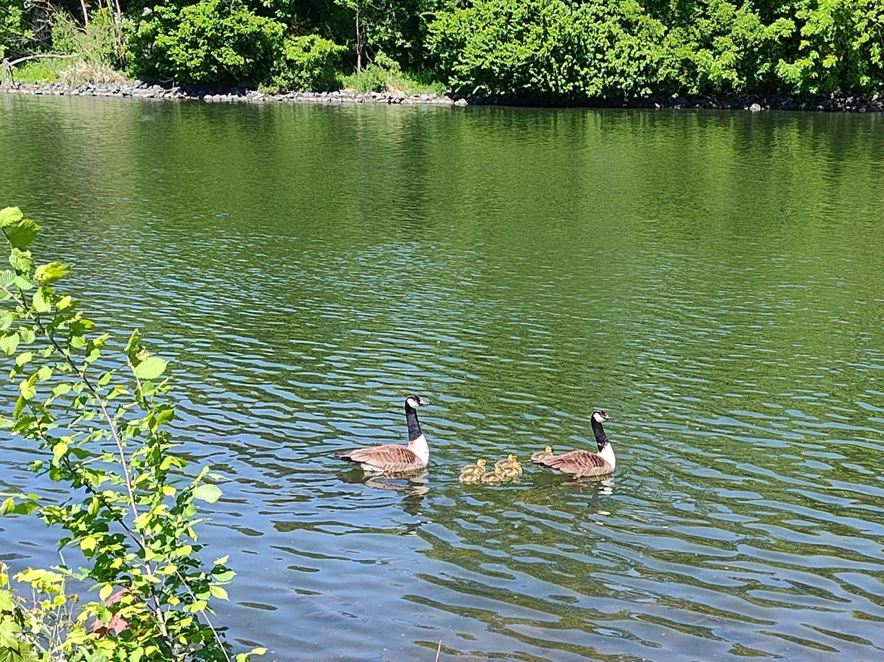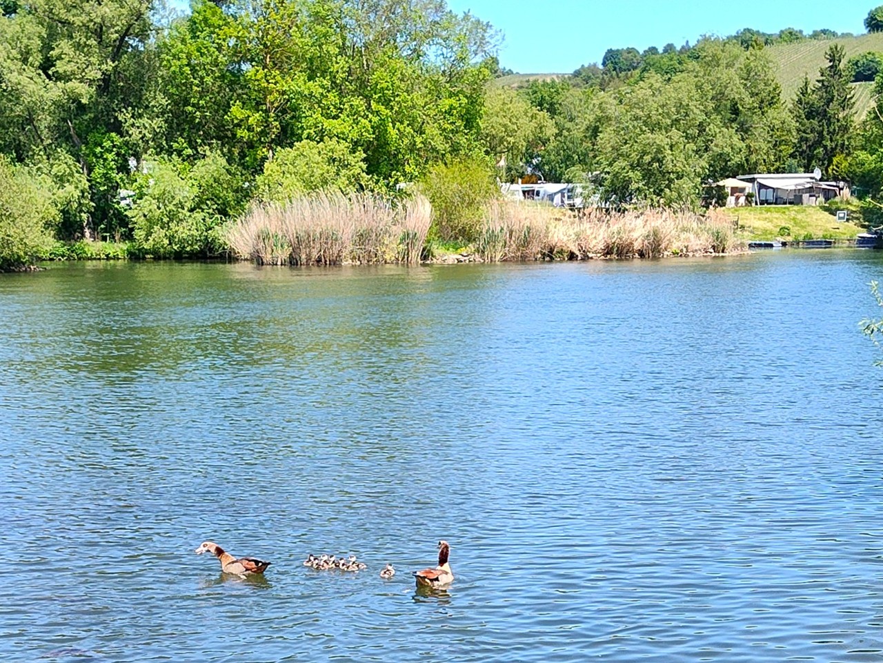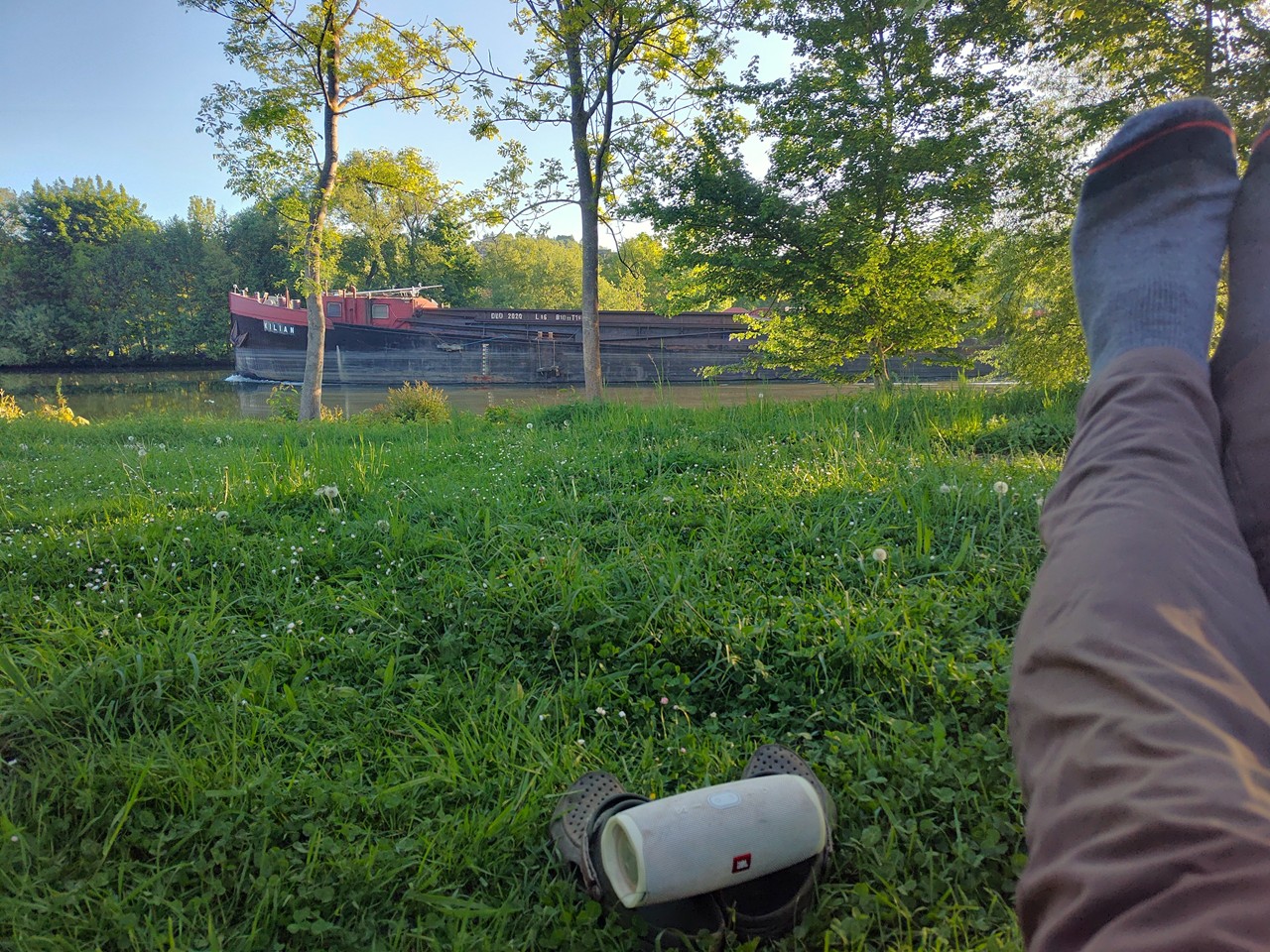 Es ist Mai, und das Leben blüht. Nicht nur auf den Wiesen, auch auf dem Fluss, wo uns verschiedene Wasservögel mit reichlich Nachwuchs begegnen. Als wir zurückkehren, geht die Sonne langsam unter.Während ich vor dem Womo Yoga praktiziere, schiebt sich ganz langsam ein großes Frachtschiff (typische Länge 110 Meter) stromabwärts an mir vorbei.