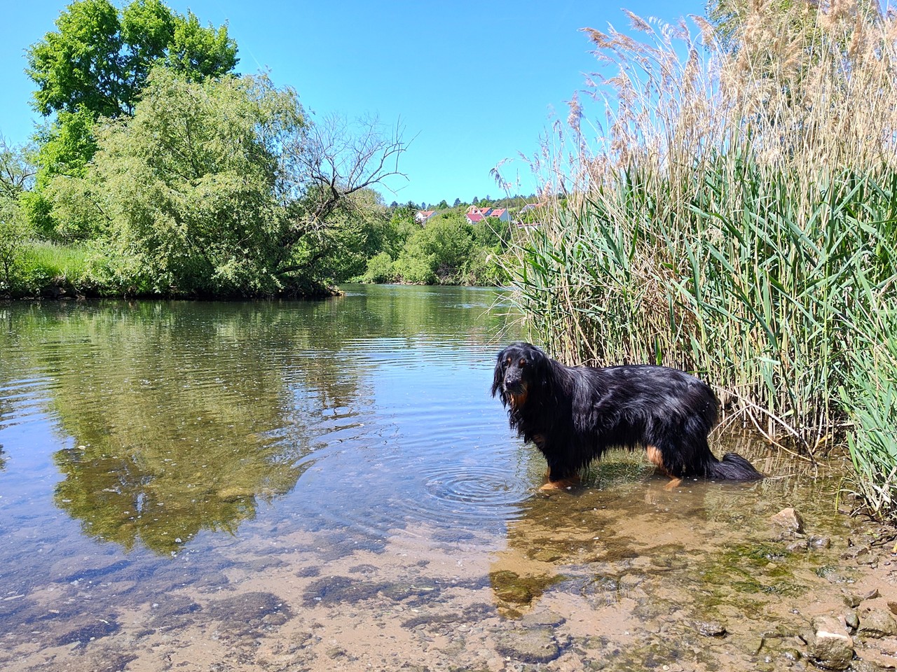 Am späten Nachmittag unternehme ich mit Doxi eine Wanderung entlang der Mainwiesen und durch den Wald oberhalb von Ochsenfurt.