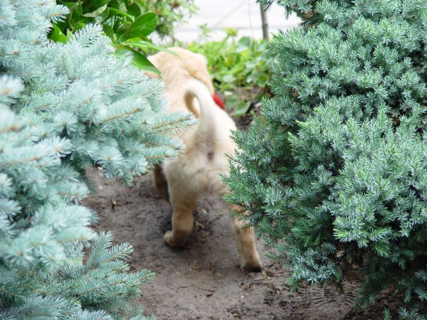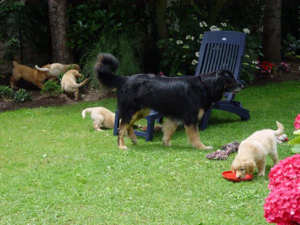 Die Welpen besitzen bereits einen ausgeprägten Beutetrieb. Zur Zeit hat es ihnen der rote Plastik-Frisbee von Bloxi besonders angetan.