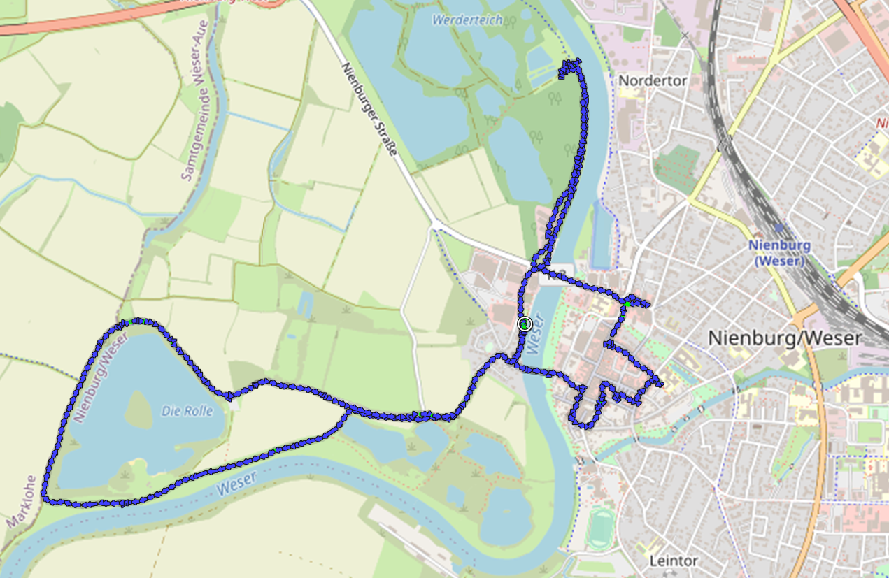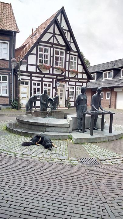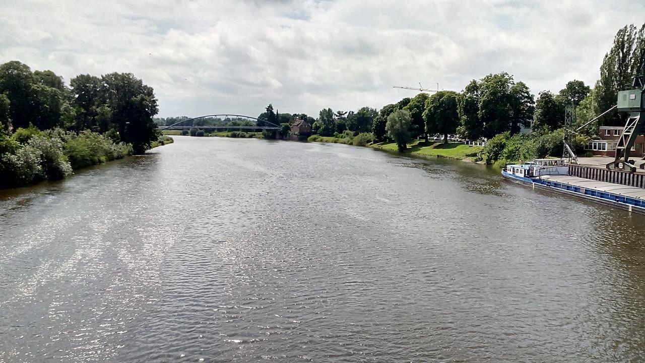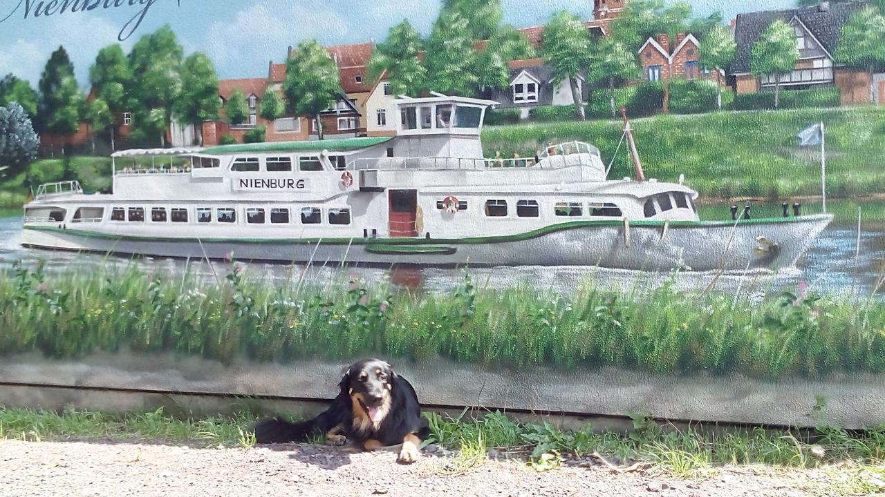 Ich habe mit Doxi einen schönen, aber nassen Tag in Nienburg verbracht. Während unseres Aufenthalts in der „Spargelstadt“ hat es innerhalb von nur vier Stunden 40 Liter Regen auf den Quadratmeter gegeben – und wir waren bei einer Wanderung an der Weser mittendrin.
