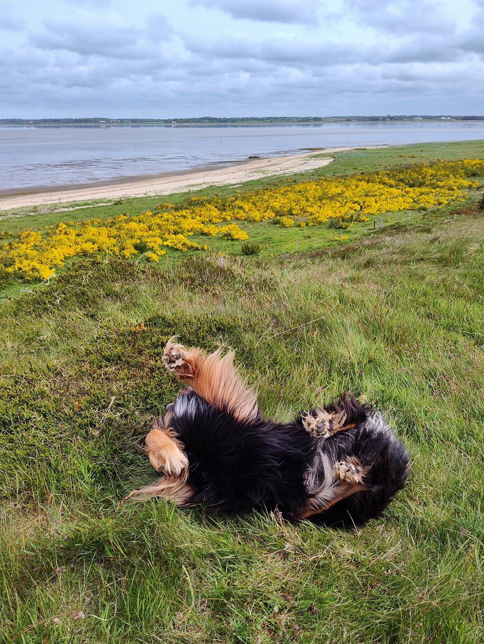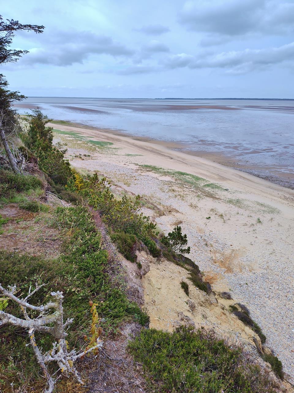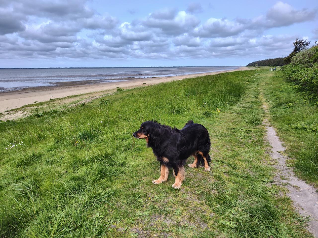 Wir starten unsere Wanderung am Hofgut Myrthueguärd, das von der Rinderzucht mit urigen Highland-Rindern lebt und außerdem eine Jugendbildungsstätte beherbergt.Der Wald reicht hier bis zur Abbruchkante oberhalb der Bucht. Der Wanderweg führt uns am Waldrand entlangi n südlichen Richtung, immer mit Blick auf das Wasser. Gerade ist Ebbe und so liegt ein guter Teil der Bucht trocken.
