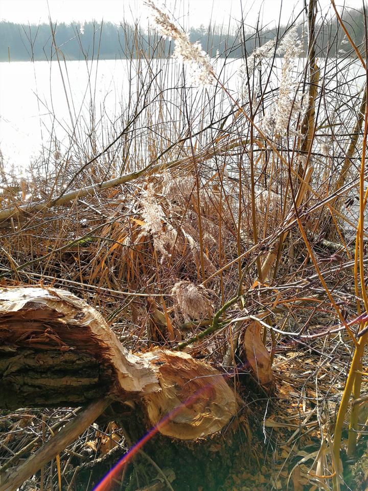 Direkt an den Wald im niederländischen Naturschutzgebiet „Rode Beek / Heringsbosch“ grenzt die NATO-Airbase Geilenkirchen, die sich bereits wieder auf deutschem Gebiet befindet. Der Wald wird von zahlreichen Bächen durchzogen und beinhaltet mehrere schöne Waldseen. Am Uferpfad können wir beobachten, wie Biber Bäume angenagt und dadurch zu Fall gebracht haben.