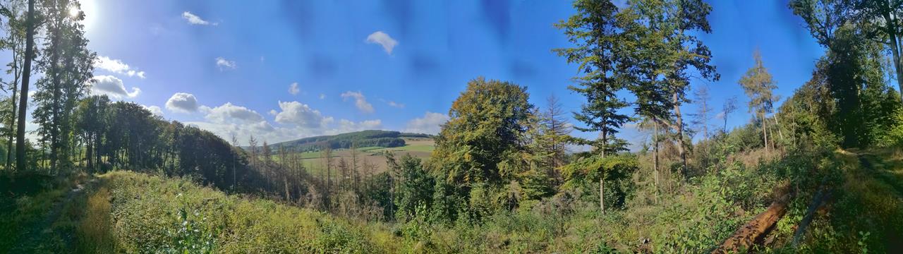 Kurz dahinter geht es in das ausgedehnte Naturschutzgebiet Beller Holz, wo wir über Feldwege und Pfade zum Meierberg aufsteigen. Von dort geht der Blick über das Tal hinüber zum Bellenberg.
