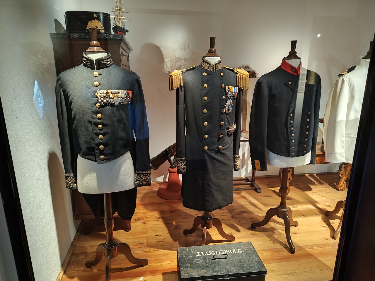 Leider habe ich den interessanten Museumsbesuch mit einem Schaden an meinem Wohnmobil-Alkoven bezahlt. Als ich auf dem Parkplatz vor dem Museum manövrierte, bin ich dachseitig an dem langen Rohr einer modernen Schiffskanone vorbeigeschrammt. Habe ich einfach nicht gesehen. Ich bin gespannt, was mich dieser Spaß kostet. Könnte ein teures Vergnügen werden.