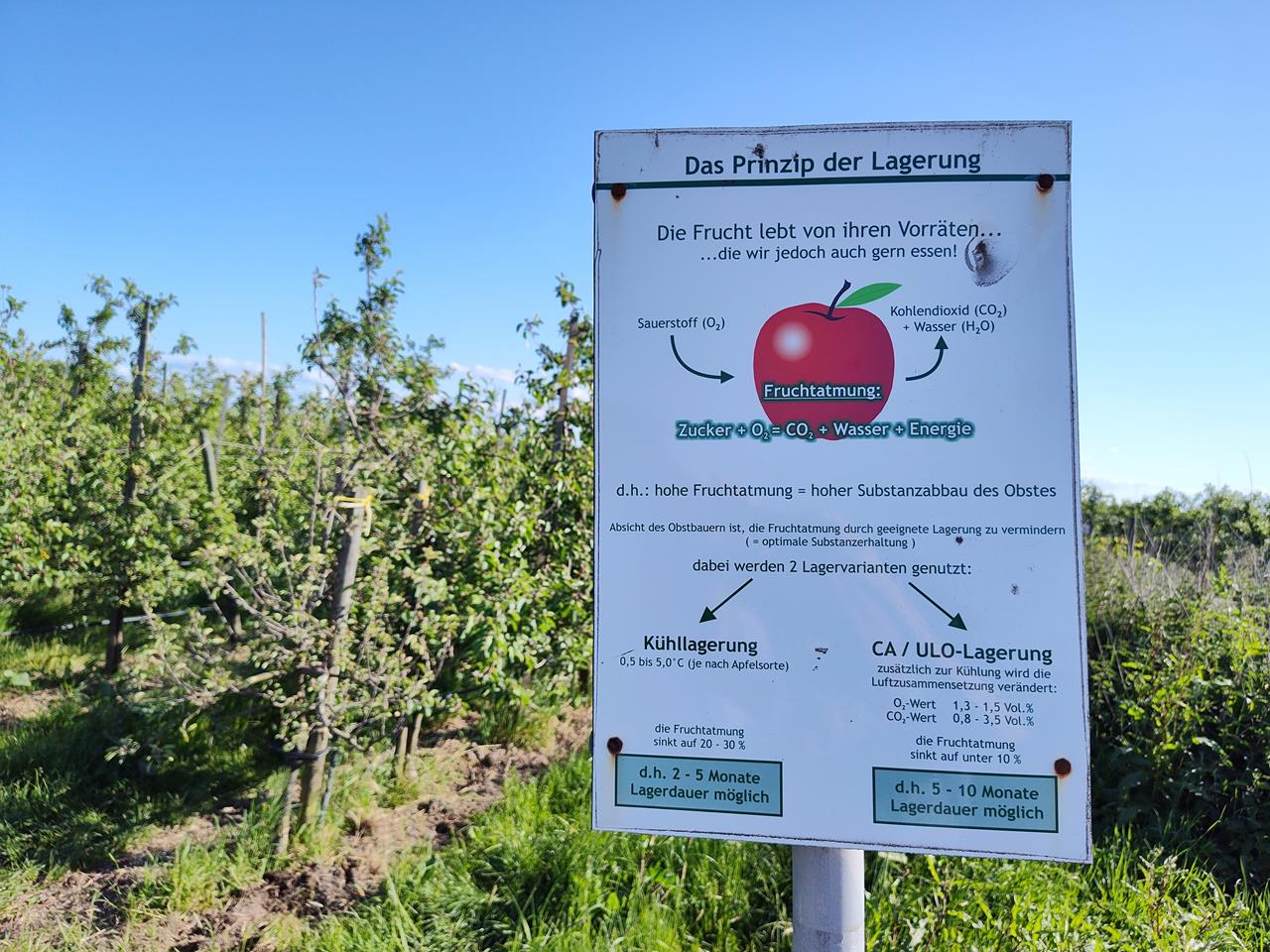 Auf dem Obstlehrpfad geben immer wieder Hinweisschilder interessante Informationen zur Obstproduktion. Z.B. warum die Kirschen unter Folie aufwachsen (damit sei nicht von zu viel Sonne aufplatzen) oder warum die CO2-Lagerung heimischen Obstes eine viel bessere Energiebilanz aufweist, als Obst aus fernen Kontinenten über die Weltmeere herbeizuschippern.