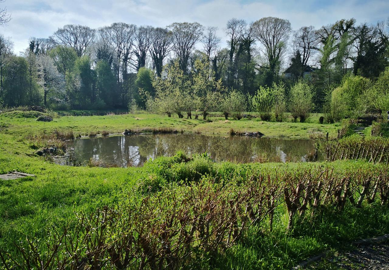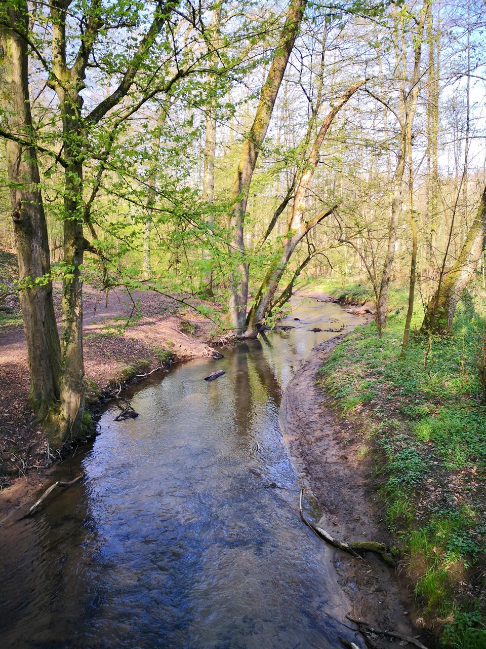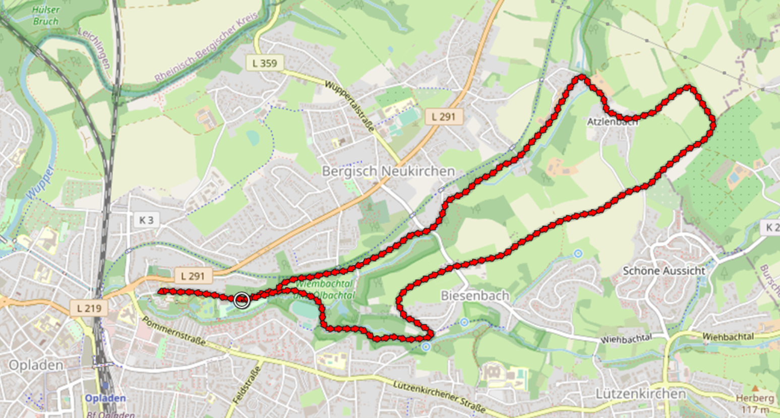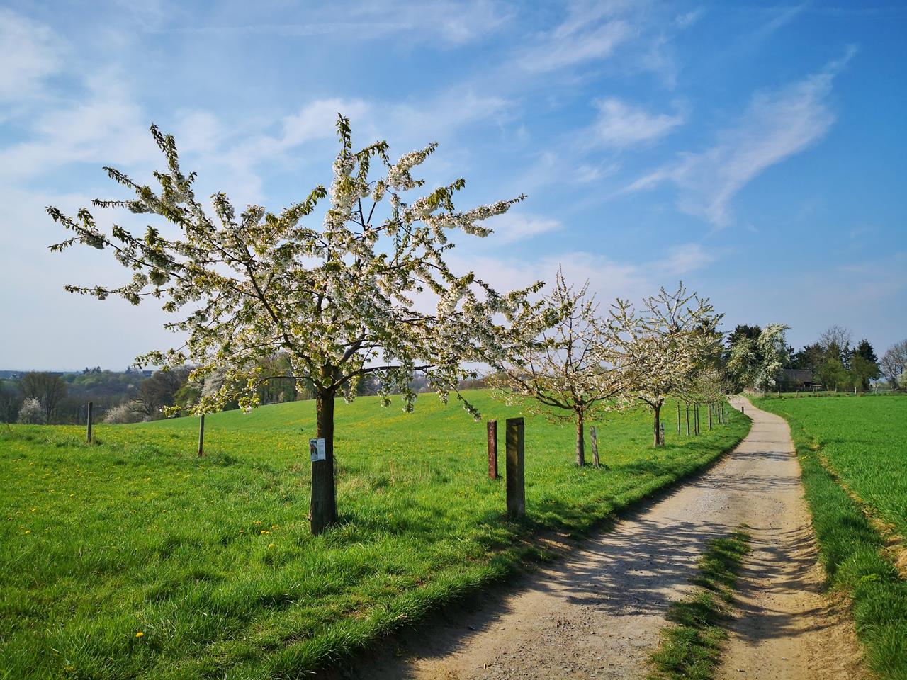 Jetzt gerade blühen bereits die Kirsch- und Pflaumenbäume, sowie die Quitten in voller Pracht. Die verschiedenen Sorten von Apfel- und Birnenbäumen entlang des Weges zeigen schon ihre Knospen, sind aber noch nicht erblüht.Der Rundwanderweg beginnt und endet dem von NABU betriebenen NaturGut Ophoven in Leverkusen-Opladen. Er folgt zunächst dem Wiembach, steigt dann bei Biesenbach zum Claashäuschen auf.