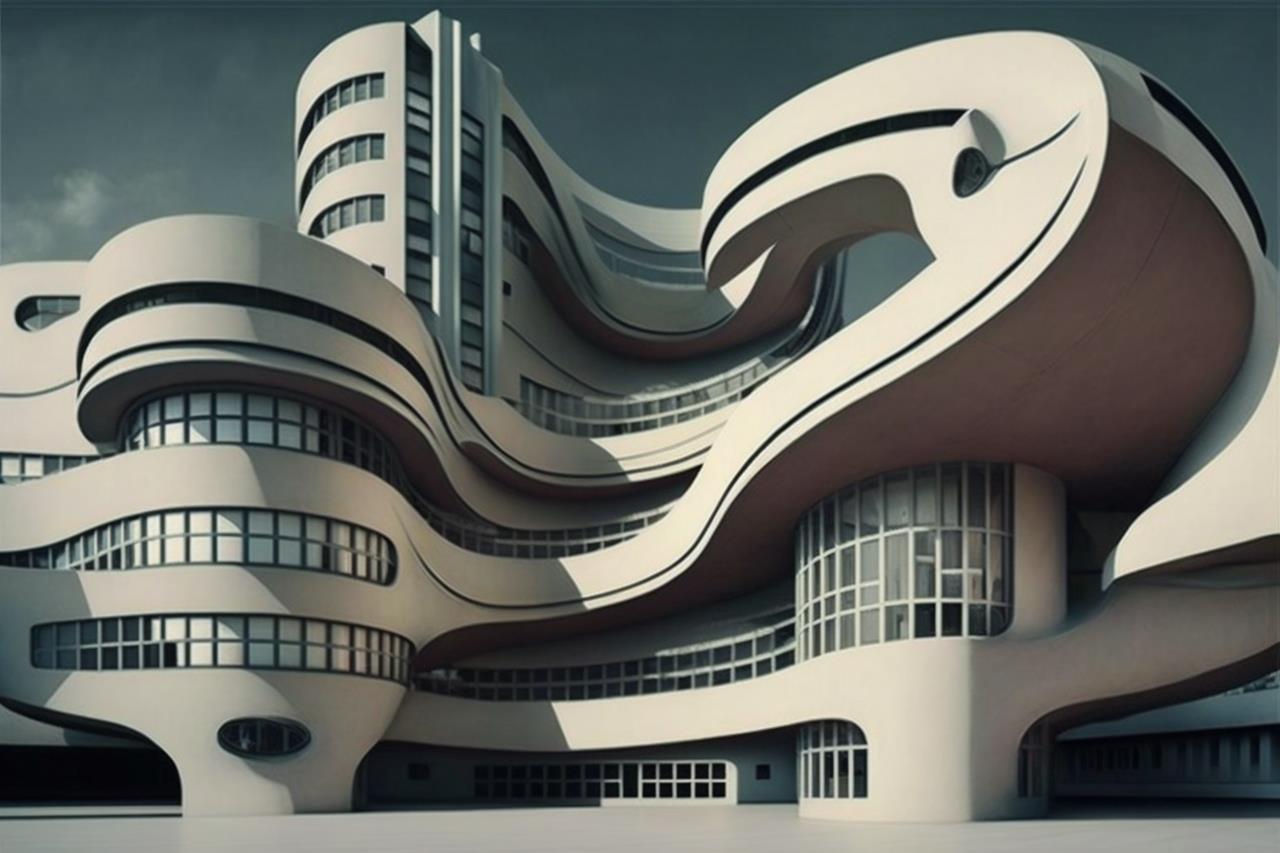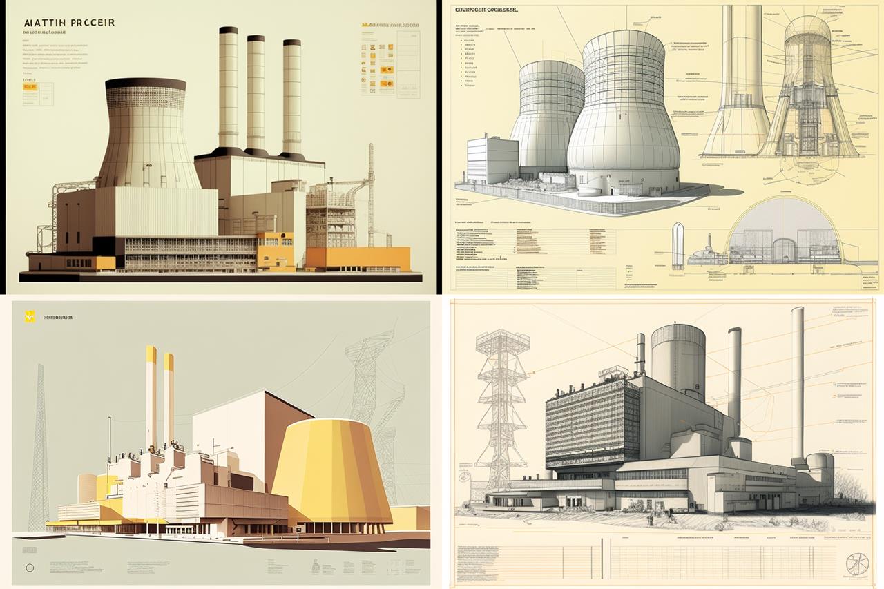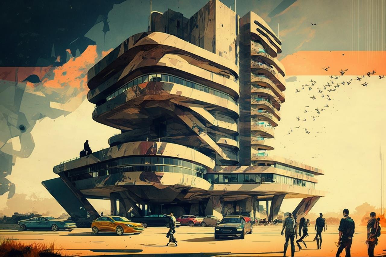 Frisch aus der KI auf meiner Festplatte: Neu erträumte Architektur-Bilder im Stile von Otl Aicher.