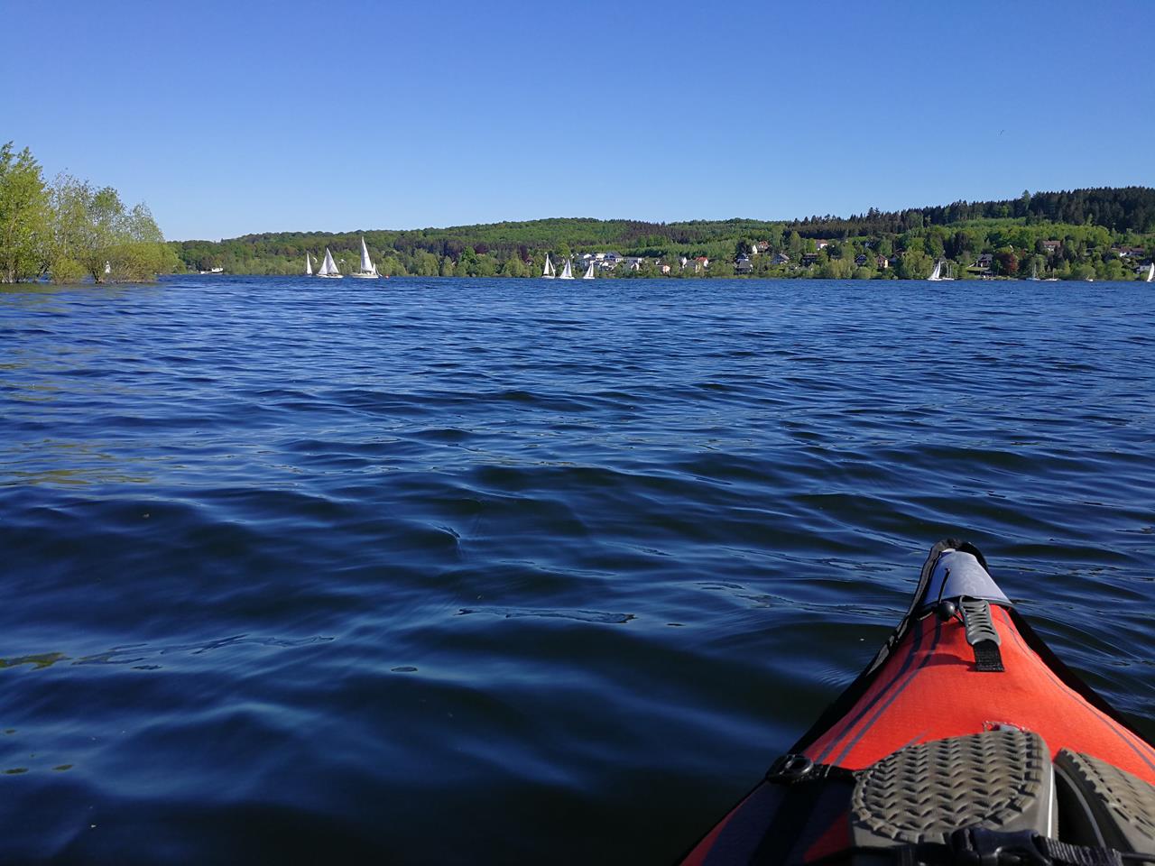 Samstagnachmittag auf dem Möhnesee bei 24 Grad und herrlichem Sonnenschein: Jede Menge Segler und Ausflüger sind auf dem Wasser unterwegs und ich mit meinem Faltboot mittendrin. Ich fahre von unserem Womo-Stellplatz See aufwärts gegen einen starken Wind und für Seeverhältnisse ganz ordentliche Wellen an.