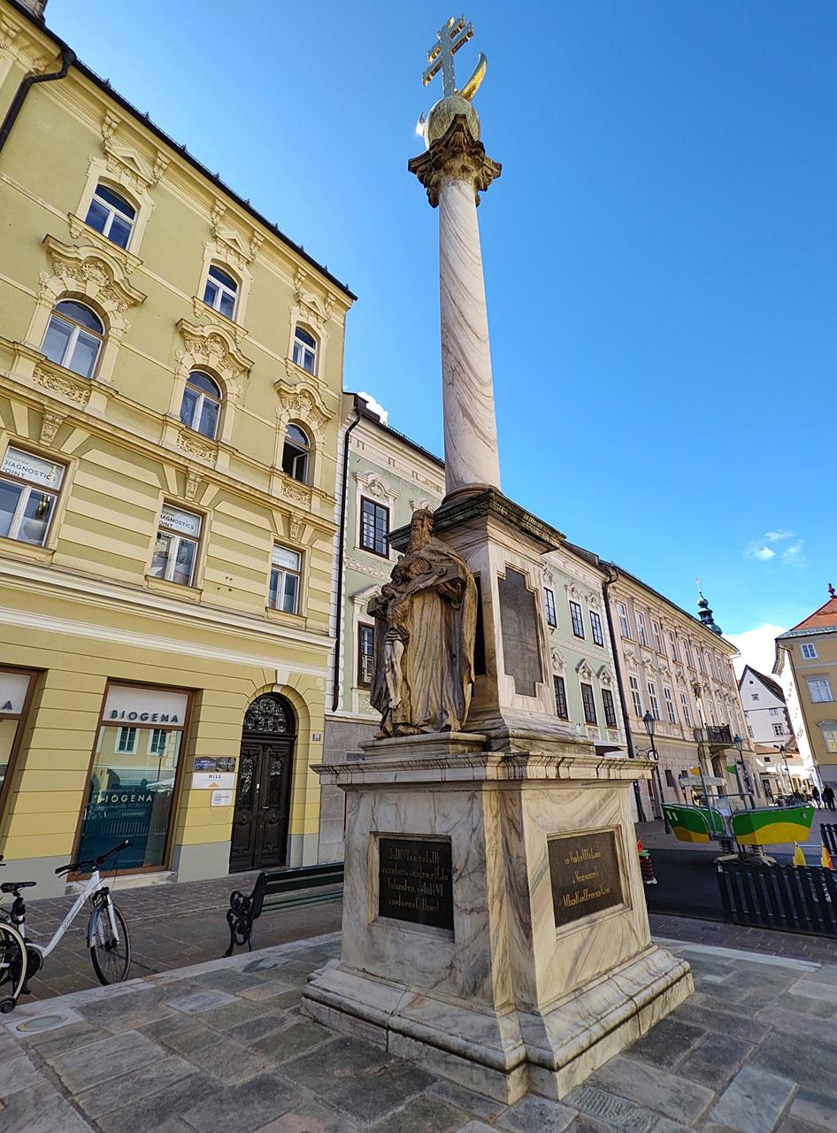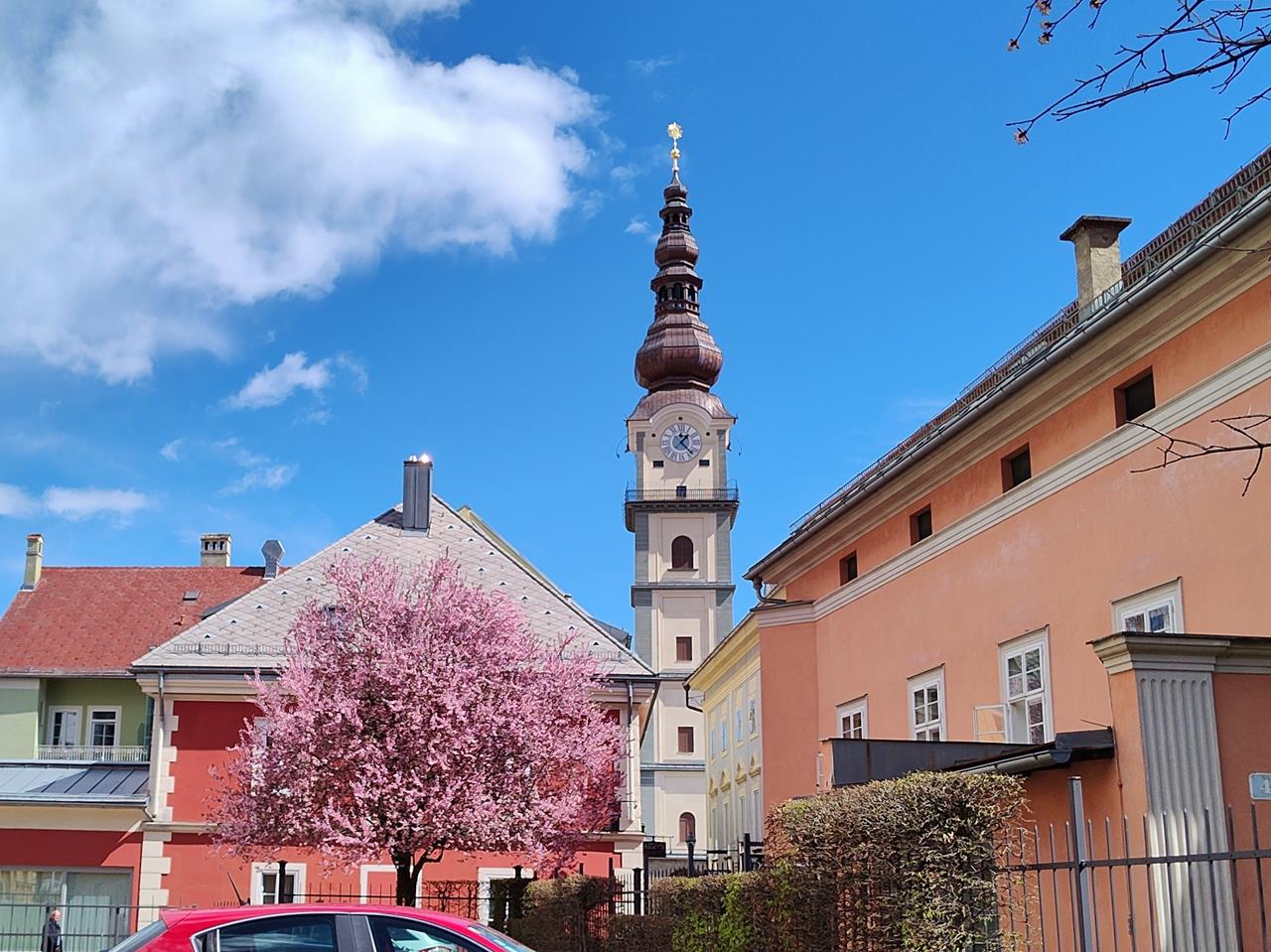 Blickt man vom Portal der Kirche über die zum Berg hin ansteigende Radetzkystraße, schaut man direkt zur Stadtpfarrkirche in der Innenstadt.