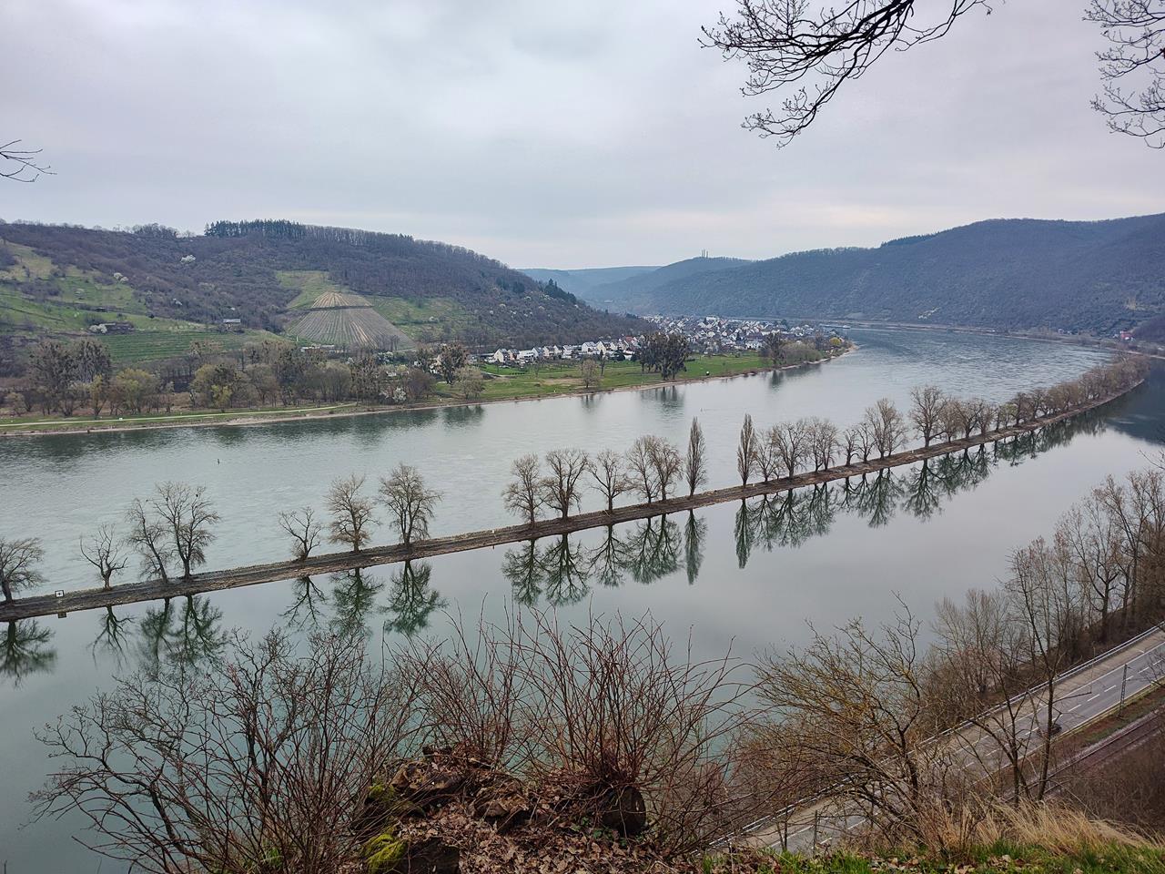 Am Nachmittag wandere ich mit Doxi den Osterspaier Langhalsweg, einen 8 km langen und mit viel Liebe ausgestalteten Wanderpfad durch die Rheinhänge. Von verschiedenen Punkten des Weges hat man einen fantastischen Blick auf den Rhein, der hier eine Schleife macht.