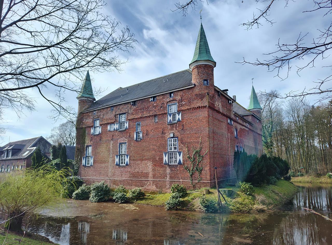 Walbeck ist weithin für seinen exzellenten Spargel bekannt, der auf den sandigen Böden der Maasdünen bestens gedeiht. Vorbei am Schloss Walbeck geht es in den Wald, wo wir sehr bald die Grenze zu den Niederlanden passieren.