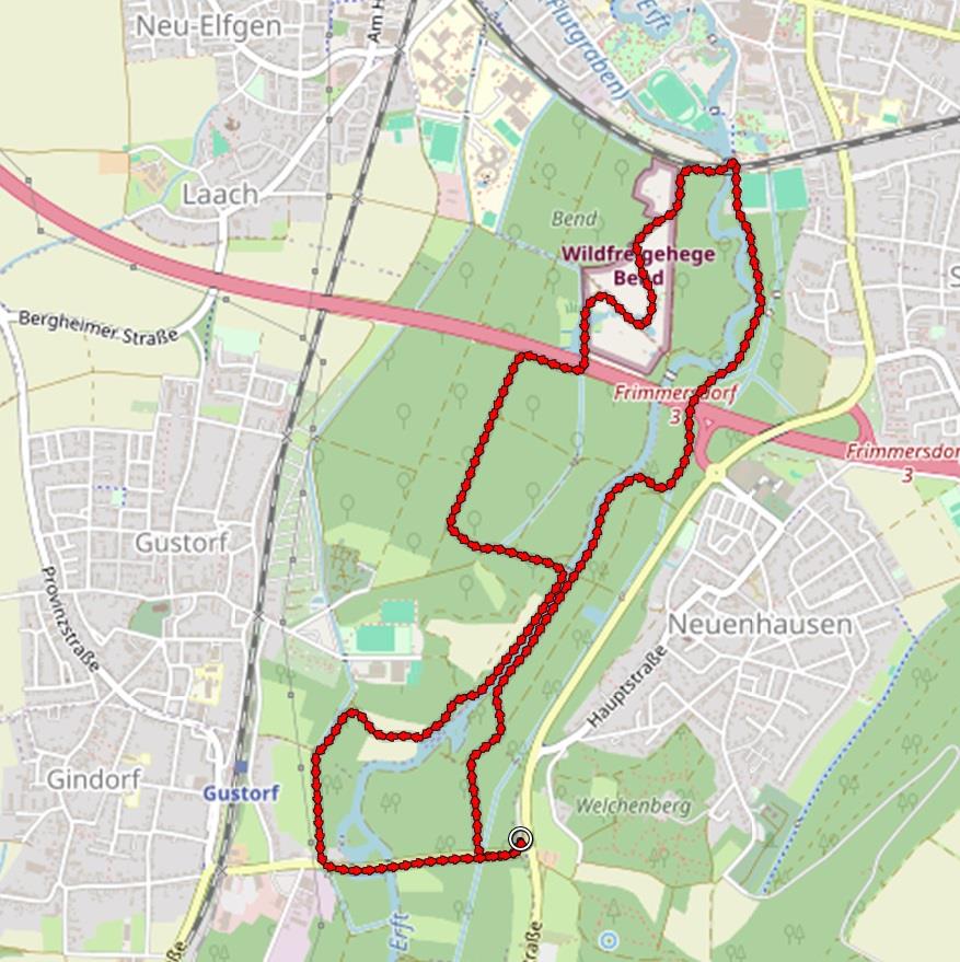 Heute eine kleine Runde bei Grevenbroich, komplett im Grünen, auch wenn alles eher Grau als Grün wirkt. Wir starten an der alten Wassermühle von Gustorf und laufen über Pfade entlang der Erft bis zum Wildtiergehege Bend am Südrand der Grevenbroicher Innenstadt.