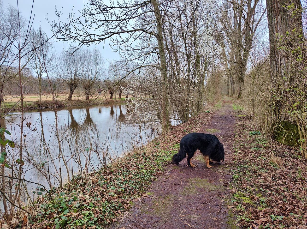 Gerne würde ich heute mit Doxi wandern gehen, aber angesichts des tristen Wetters lohnt es sich nicht wirklich, dafür weiter wegzufahren. Also laufen wir 10 km in der näheren Umgebung, und zwar vom Selikumer Park bei Neuss-Reuschenberg zur Erfmündung in den Rhein.