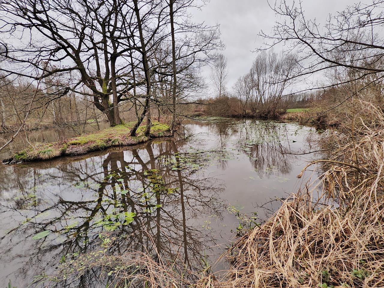 Wie ich aus der Ferne beobachten kann, haben die Wasservögel das neue Areal bereits angenommen. Doch leider kommen wir hier nicht richtig durch. Die Fußwege fehlen noch und so landen wir schnell in einer Sackgasse. Also kehren wir um und laufen entlang der Erft zurück zu unserem Startpunkt.