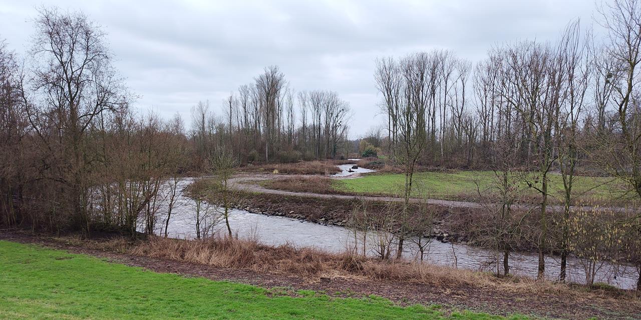 Dort wird die Erft, deren Wasserstand künftig nach dem Ende des Braunkohletagebaus im Rheinland viel tiefer stehen wird, gerade renaturiert. Die neuen Erftauen bilden den ursprünglichen mäandernden Flusslauf nach.
