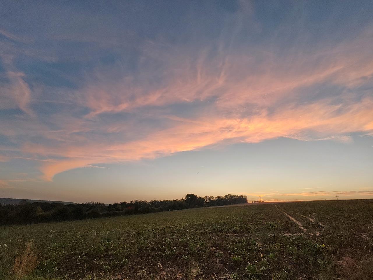Wir wandern oben auf dem Plateau zurück in Richtung Bietigheim, während am Horizont langsam die Sonne untergeht und die wenigen Wolken in ein rotes Licht taucht. Nach knapp zwei Stunden und acht Wanderkilometern erreichen wir schließlich wieder unseren Ausgangspunkt in Bietigheim.