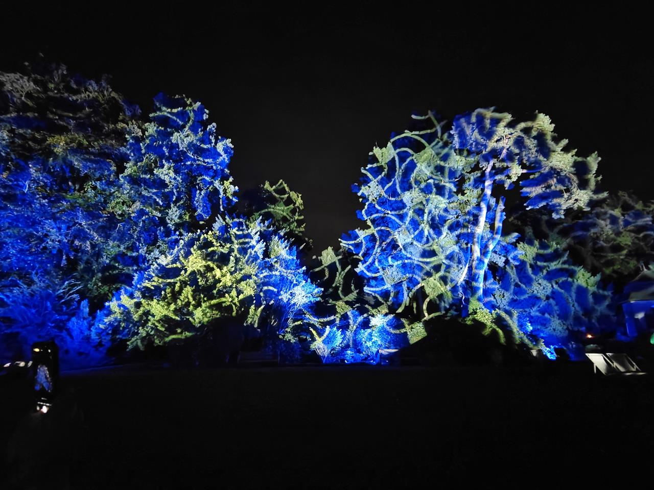 Überall im Park laden Bänke und Stühle zum Verweilen ein. Wenn die mächtigen alten Bäume im Park von den großen Scheinwerfern in ein buntes Licht getaucht werden, sieht das wirklich magisch aus.