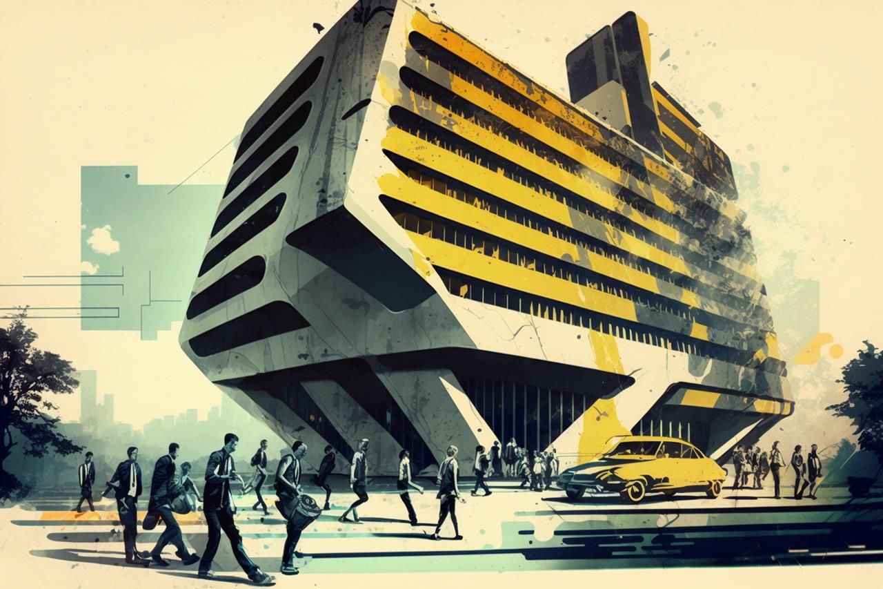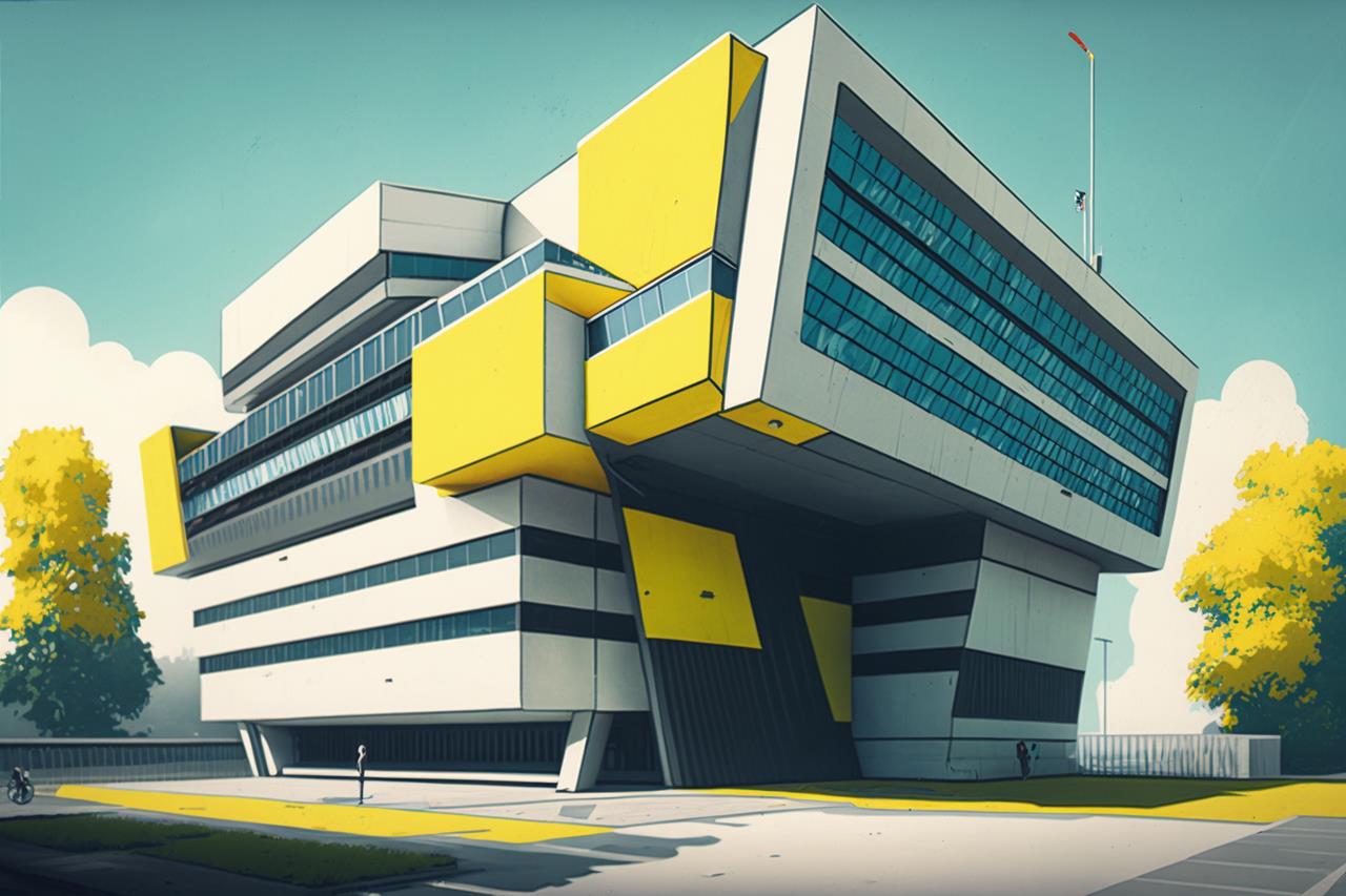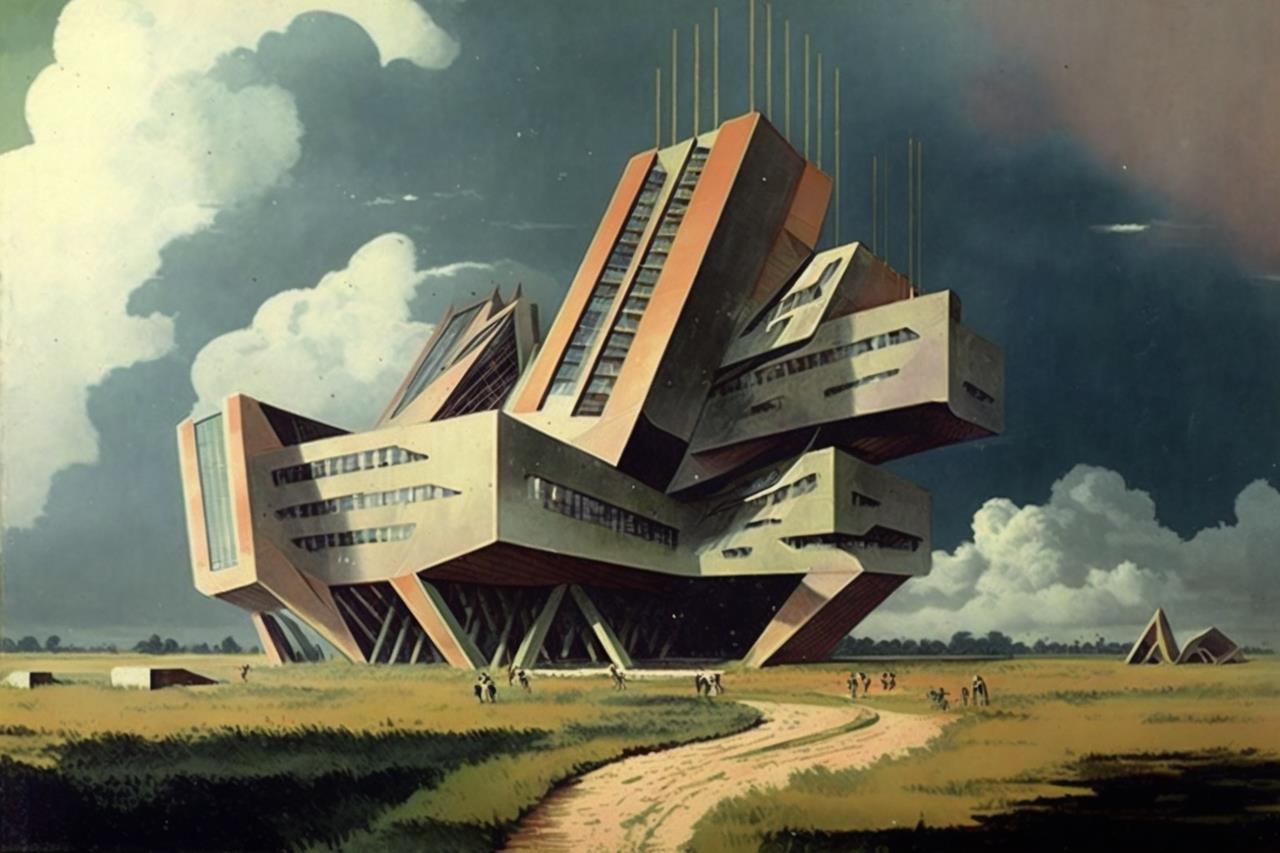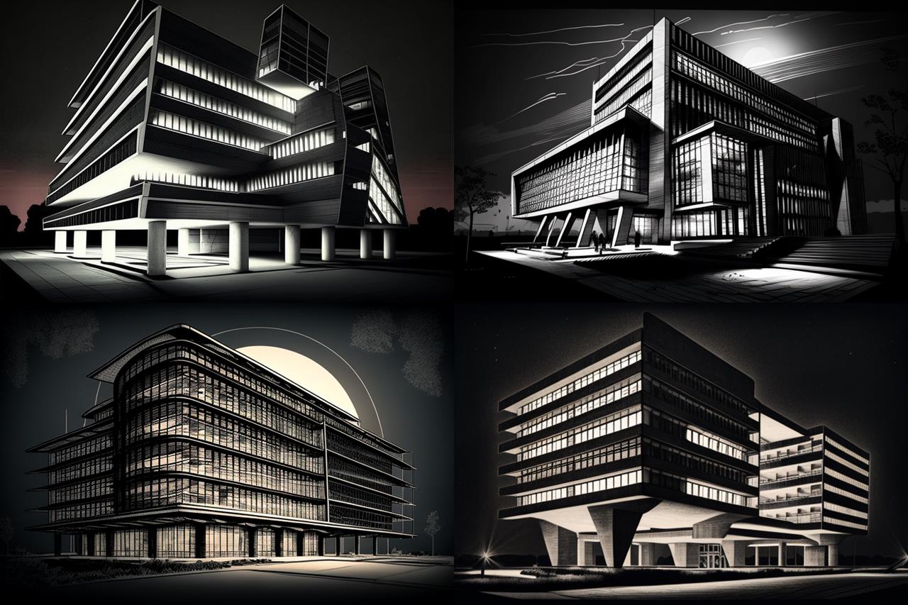 Frisch aus der KI auf meiner Festplatte: Neu erträumte Architektur-Bilder im Stile von Otl Aicher.