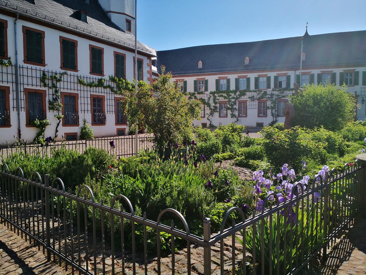 Aus dem verschlafenen Winzerdorf steigen wir zunächst in die Weinberge am Schanzenkopf auf. In deren Südlage hat man einen grandiosen Fernblick in die Ebene zwischen Main und Rhein. In der Ferne tauchen die großen Sendemasten bei Seligenstadt auf, die wir gestern besucht haben.Weiter geht es durch den lauschigen Wald, der uns gut vor der starken Sonneneinstrahlung an diesem Sonntagnachmittag schützt. Über die Elbernhöhe und das Hemsbacher Kreuz steigen wir zum Gipfel des Hahnenkamms auf und folgen dabei dem Marienweg.