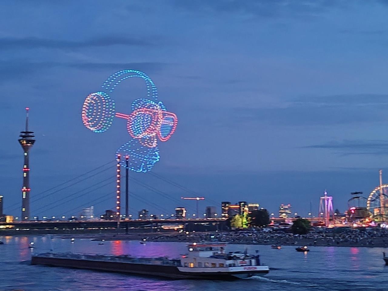 Am zweiten Tag der Düsseldorfer Rheinkirmesbegeistert eine Lichter- und Animationsshow mit eintausend Drohnen in der Luft hunderttausende von Besuchern.