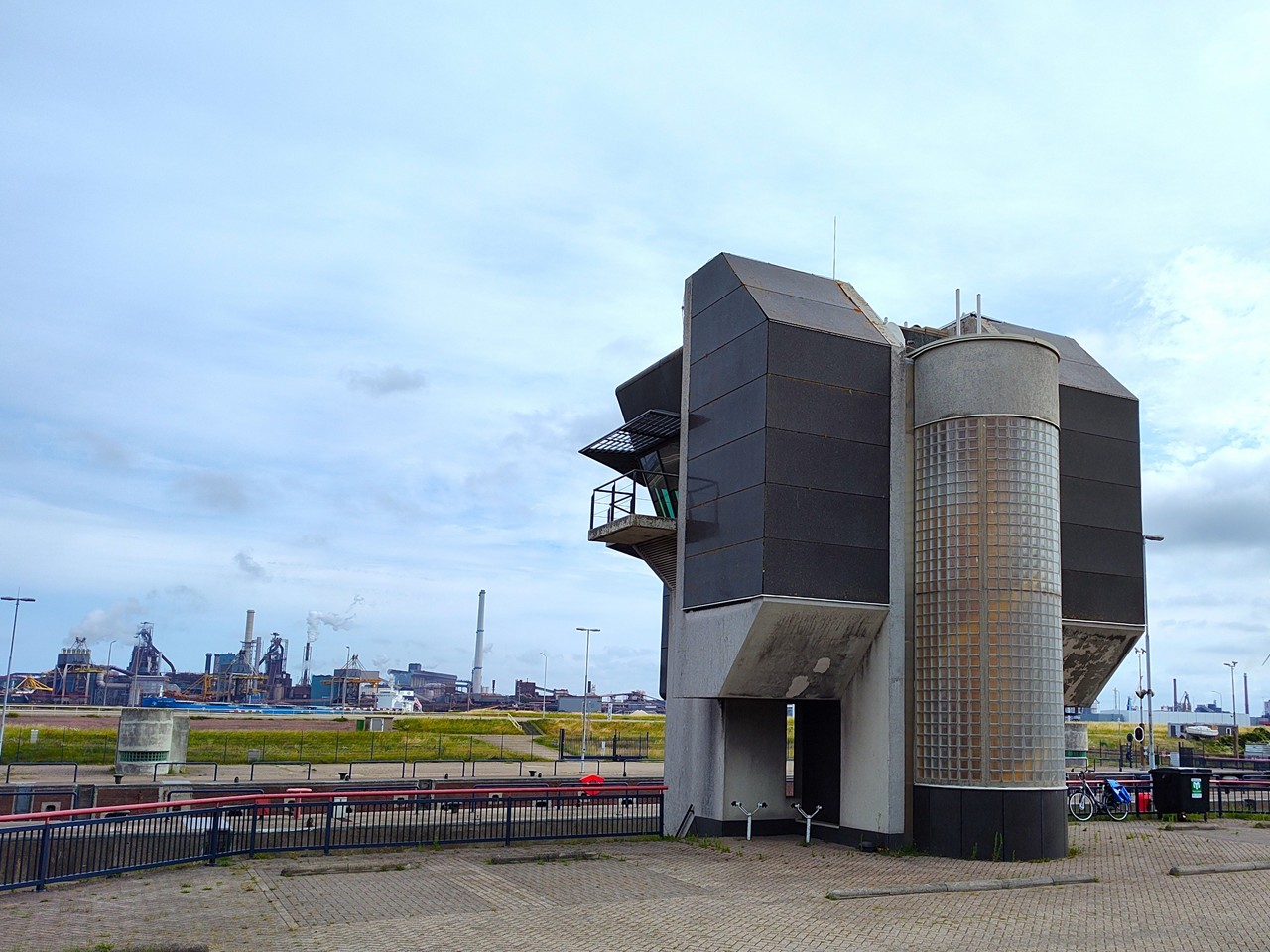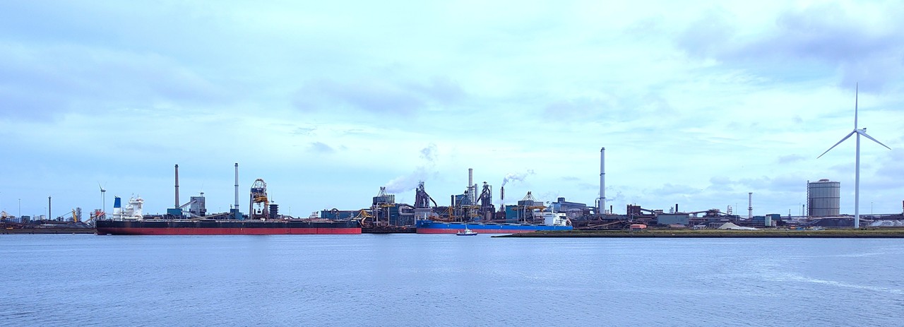 Hinter den Schleusen erheben sich die Schlote des 1918 errichteten Stahlwerks „Koninklijke Hoogovens“, das heute zur indischen Tata-Gruppe gehört. Aus dem Werksgelände dampft es gewaltig in den Himmel – ein Zeichen, dass die Hochöfen nicht stillstehen.