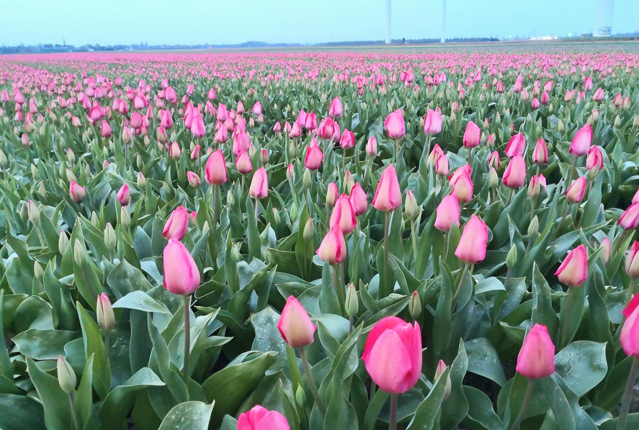 Noch sind viele Tulpenreihen im Wachstum begriffen, doch an einigen Stellen hat sich die bunte Blütenvielfalt bereits voll entfaltet. Und als wir gerade die ersten Fotos machen wollen, tritt die untergehende Abendsonne zwischen den Wolken hervor und taucht die Blumenreihen in ein wunderbar warmes Licht. Herrlich ist das!