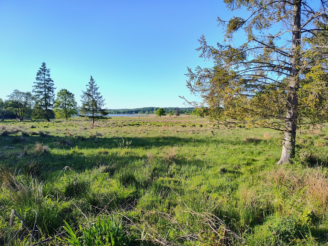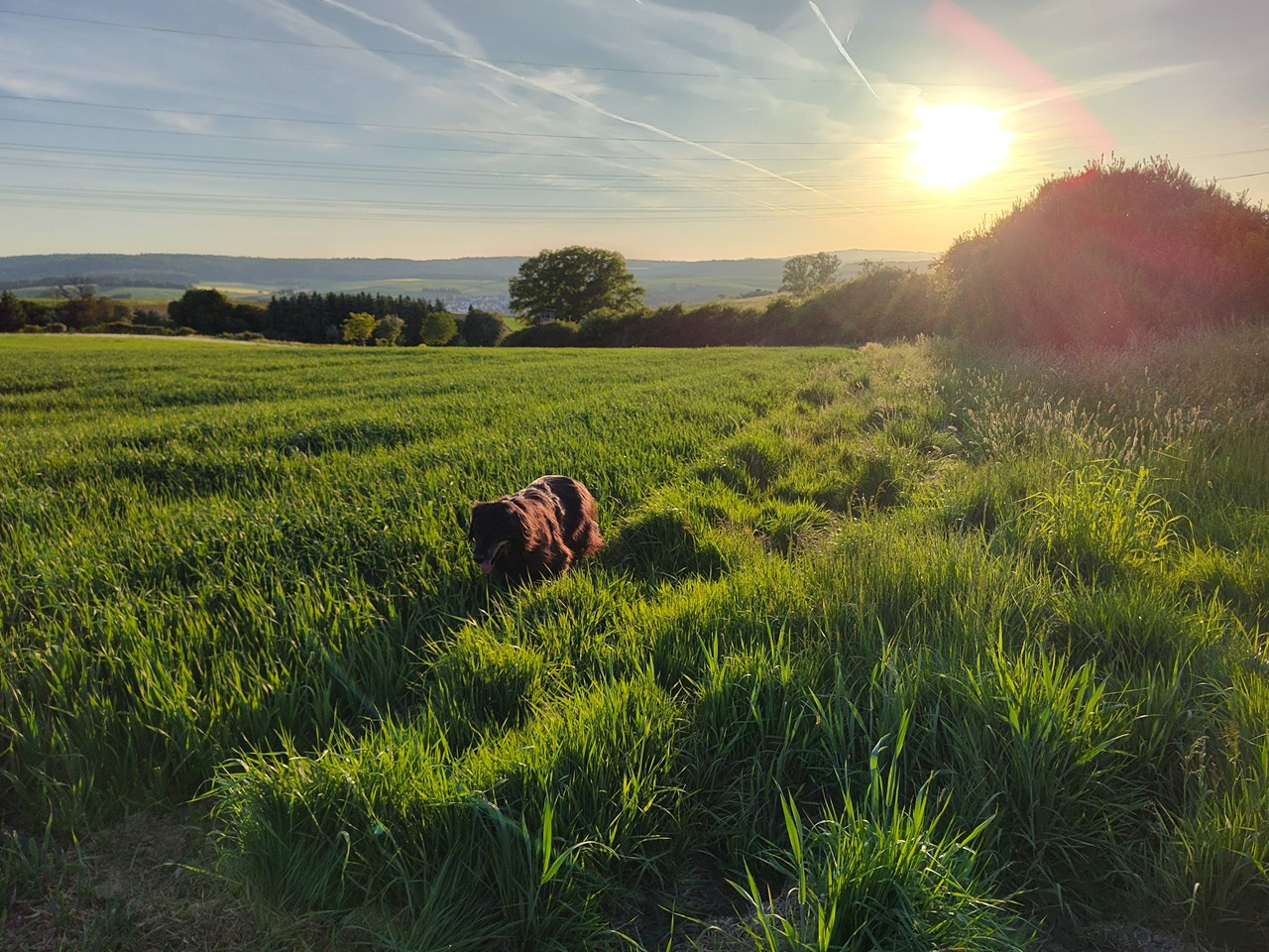 Am Abend erkunde ich mit Doxi die leicht hügelige Umgebung unseres Stellplatzes. Viele Pferdeweiden gibt es hier und Feldflächen mit Weizen. Dazwischen immer wieder einzelne Baumgruppen, aber nur wenige asphaltierte Feldwege. Dafür frisch gemähte Traktorwege und Trampelpfade, denen auf wir auf einer 6 km Runde folgen.