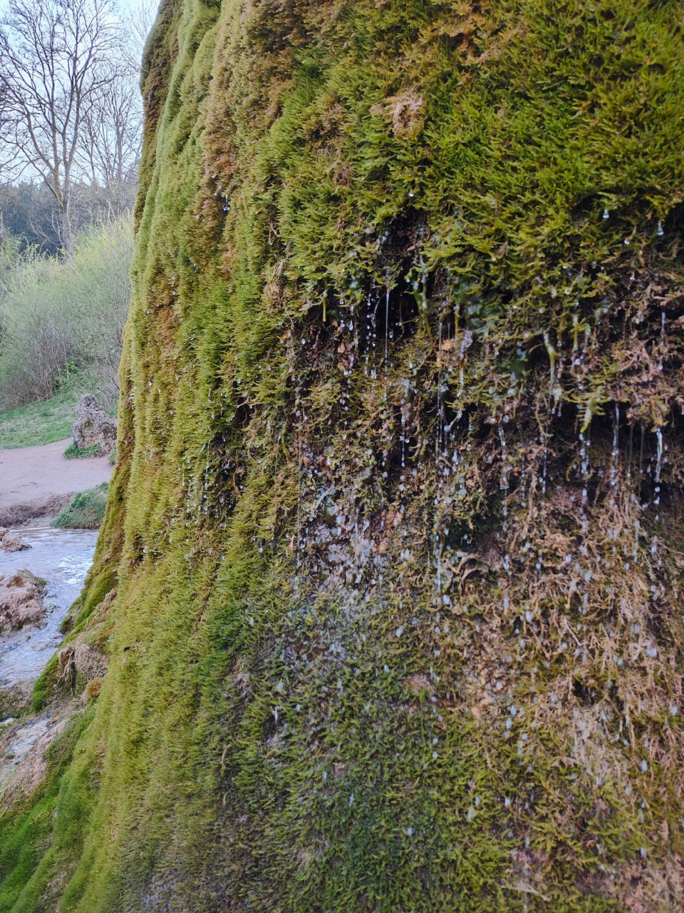 Durch ihr ständiges Wachstum entgehen die äußeren Moosschichten der Überkrustung mit Kalk. Jedoch sterben die untersten Schichten direkt am Felsgestein nach und nach ab, werden überkrustet und bilden so fortlaufend neues, poröses Sintergestein. Daraus ergibt sich der beschriebene „Vortrieb“ des Felsens unter dem Wasserfall von rund 10 cm pro Jahr. Was es nicht alles gibt.