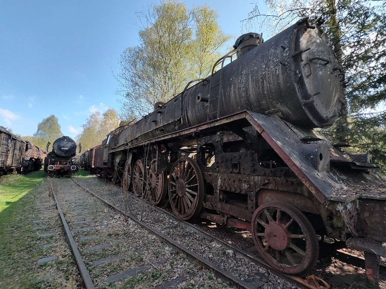 50 Großdampfloks sowie einige Diesel- und E-Loks ruhen auf dem Gelände neben dem früheren Bahnhof. Viele rotten im Freien dicht an dicht auf den Gleisen vor sich hin, werden von Regen und Pflanzen langsam zersetzt. Moose und Flechten wuchern, Löcher klaffen, die Stahlhaut wirft Schuppen.