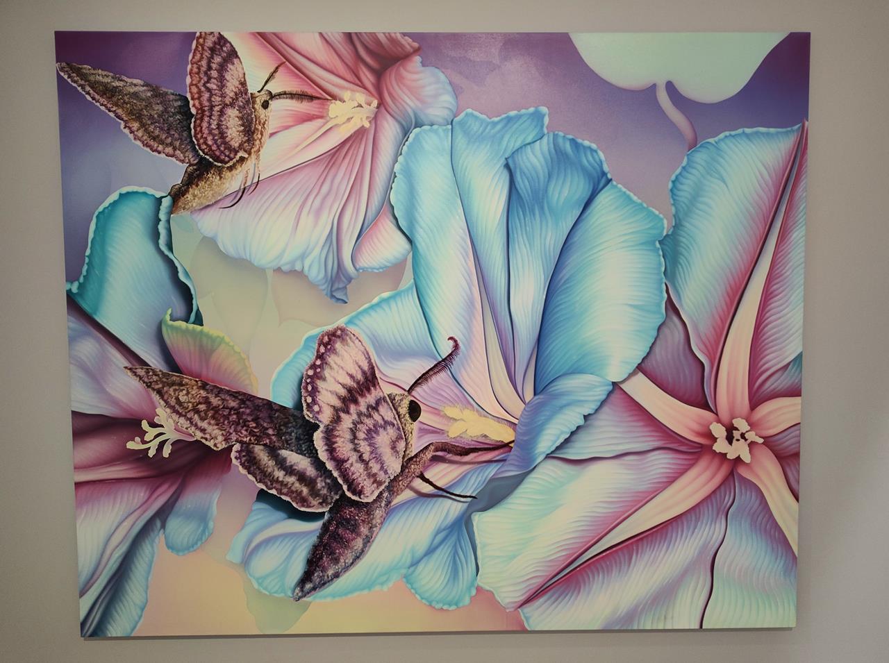 Ihre farbintensiven und fantastisch wirkenden Darstellungen verbinden überdimensionierte Pflanzen und Insekten zu fast beklemmenden Tableaus. Damit bringt sie uns das Leben und Wirken von Raupen, Schmetterlingen und Spinnen so nahe, als würden wir sie unter dem Mikroskop betrachten, und das ganz konsequent in jedem Bild. Eine eindrückliche Ausstellung.