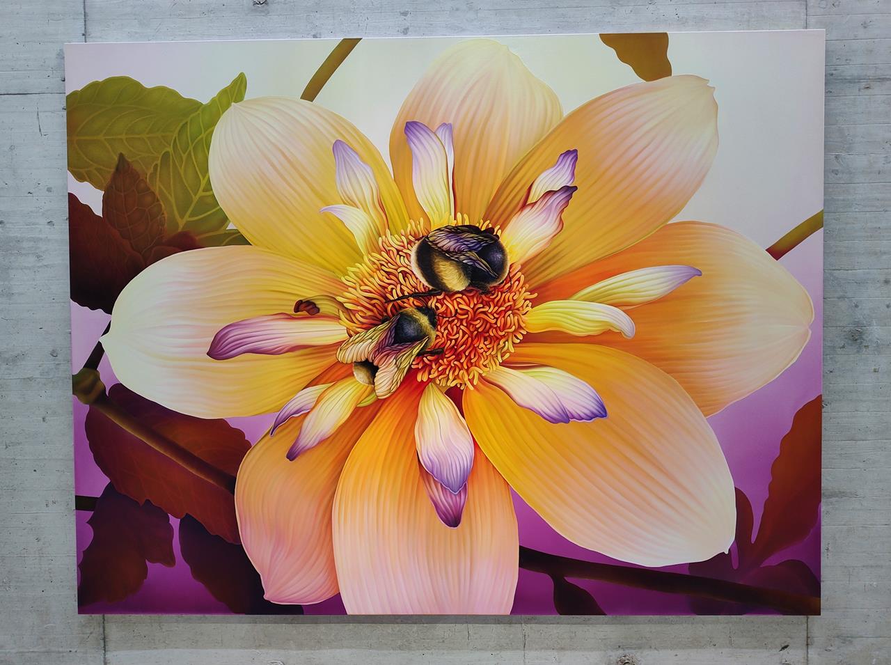 Ihre farbintensiven und fantastisch wirkenden Darstellungen verbinden überdimensionierte Pflanzen und Insekten zu fast beklemmenden Tableaus. Damit bringt sie uns das Leben und Wirken von Raupen, Schmetterlingen und Spinnen so nahe, als würden wir sie unter dem Mikroskop betrachten, und das ganz konsequent in jedem Bild. Eine eindrückliche Ausstellung.