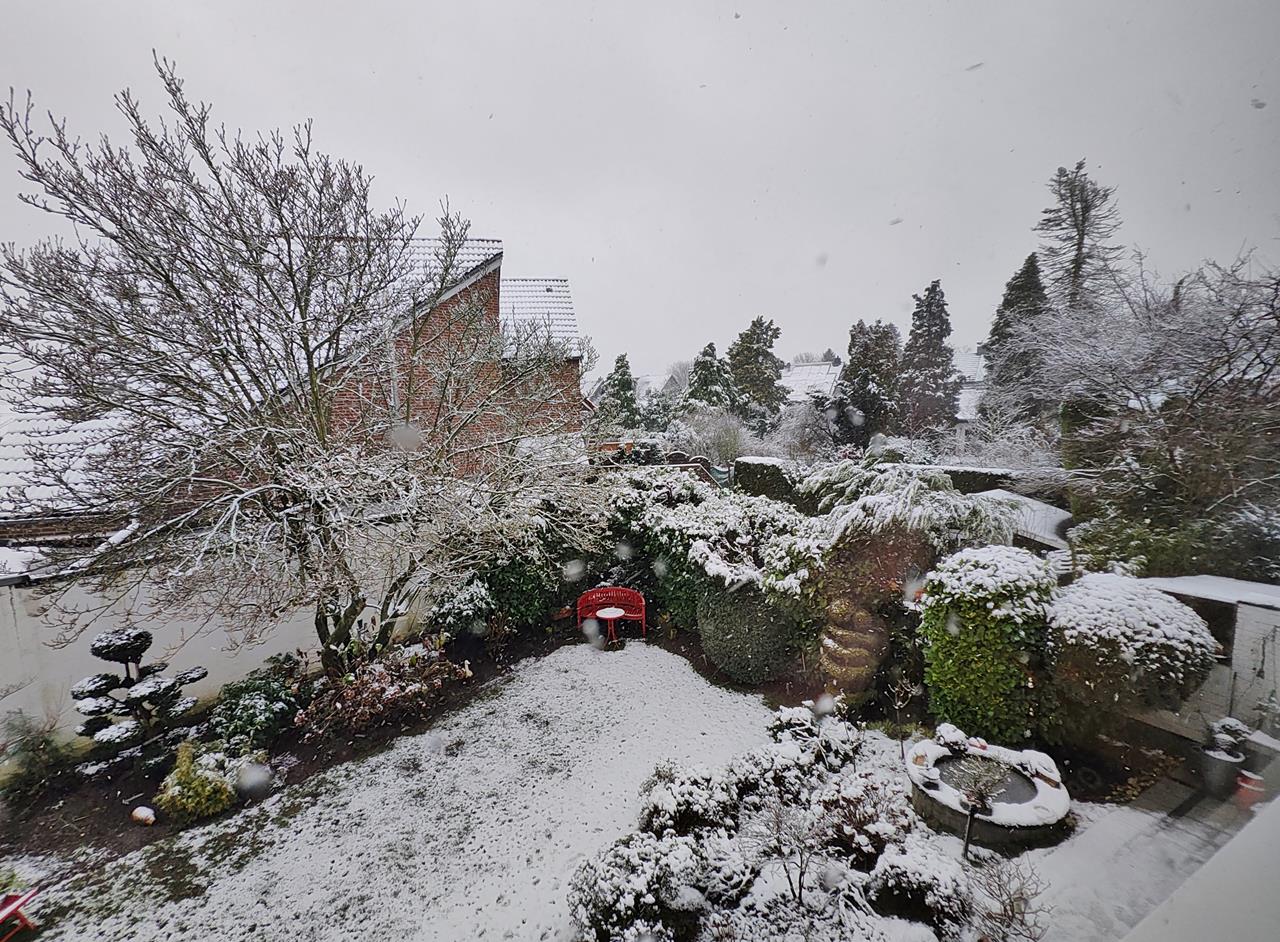 Der erste Schnee bei uns im Flachland in diesem Jahr und gleich ein Riesengematsche. Seit 12 Stunden hat es fast ununterbrochen geschneit, doch bei Temperaturen knapp über dem Gefrierpunkt verwandelt sich die weiße Pracht am Boden schnell in pappige Sulze. Ohne passendes Schuhwerk wäre ich bei meiner Feldwanderung mit Doxi komplett aufgeschmissen, überall tiefe Pfützen unsichtbar unter dem Schnee. Doch mit Gummistiefel ist alles easy. Endlich mal wieder Schnee!