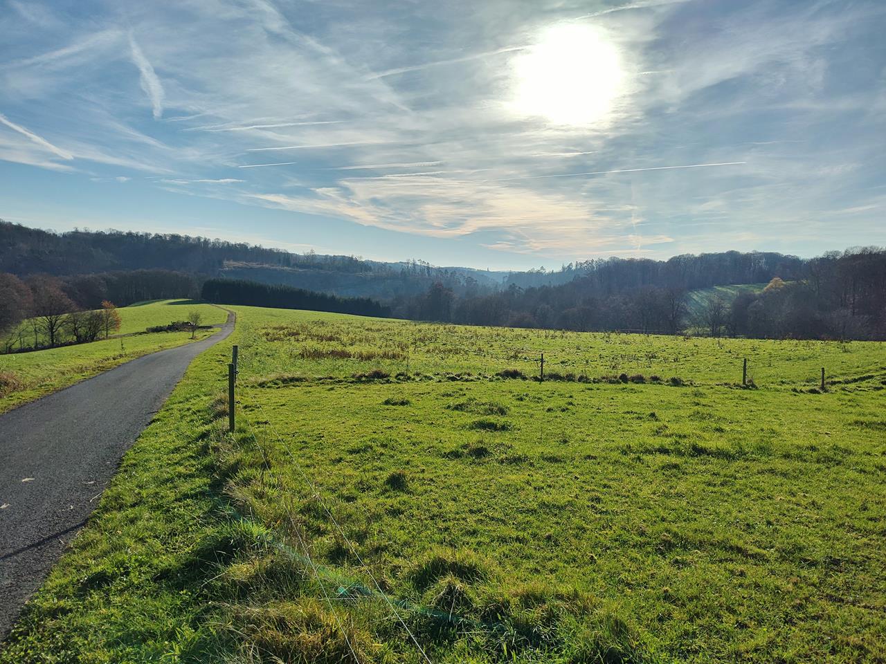 Von unserem Startpunkt in Wolperathgeht Blick in südlicher Richtung weit hinaus bis zum Siebengebirge am Horizont. Tatsächlich laufen wir zunächst in südlicher Richtung bis ins Tal der Birkenmühle und dann wieder hinauf, um in nördlicher Richtung die Wahnbachtalsperre zu erreichen.
