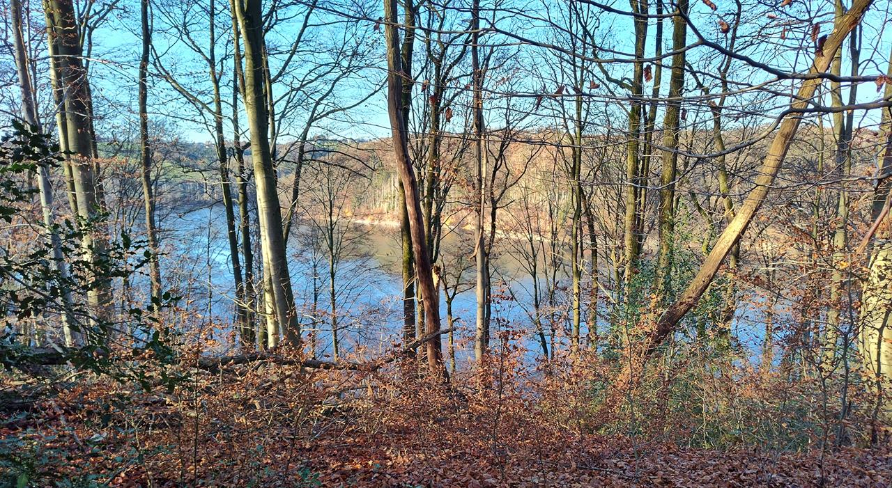 Am Rande von Wierscheid haben wir von einem Felsvorpsrung einen tollen Blick über den westlichen Teil der Talsperre bis hin zur Staumauer. Rund zweieinhalb Stunden sind wir auf dieser 11 km langen Runde unterwegs. Auf den Höhen begleitet uns ein schneidiger Wind, doch im Wald, wo der Wind nicht weht und die Sonne durch die kahlen Äste dringt, ist es richtig lieblich.