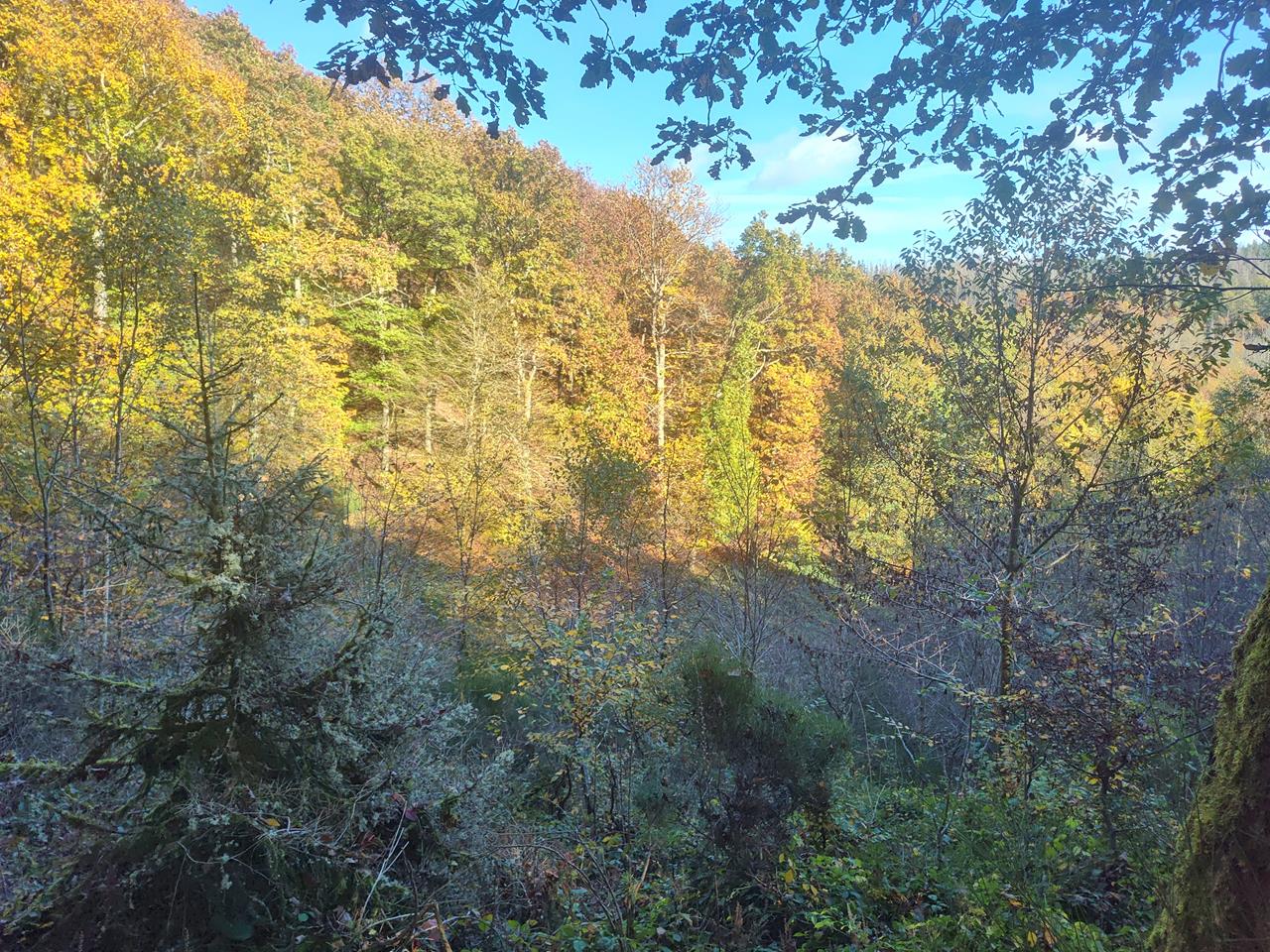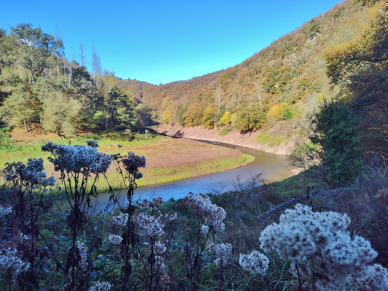 Mit Doxi bin ich heute 12 km durch den großen Wald im Nationalpark Eifel zwischen Gemünd und Heimbach gestapft. Tief im Kermeter und auf selten begangenen Forstwegen waren wir komplett allein unterwegs. Unter uns das Urfttal, über uns der srahlend blaue Himmel.