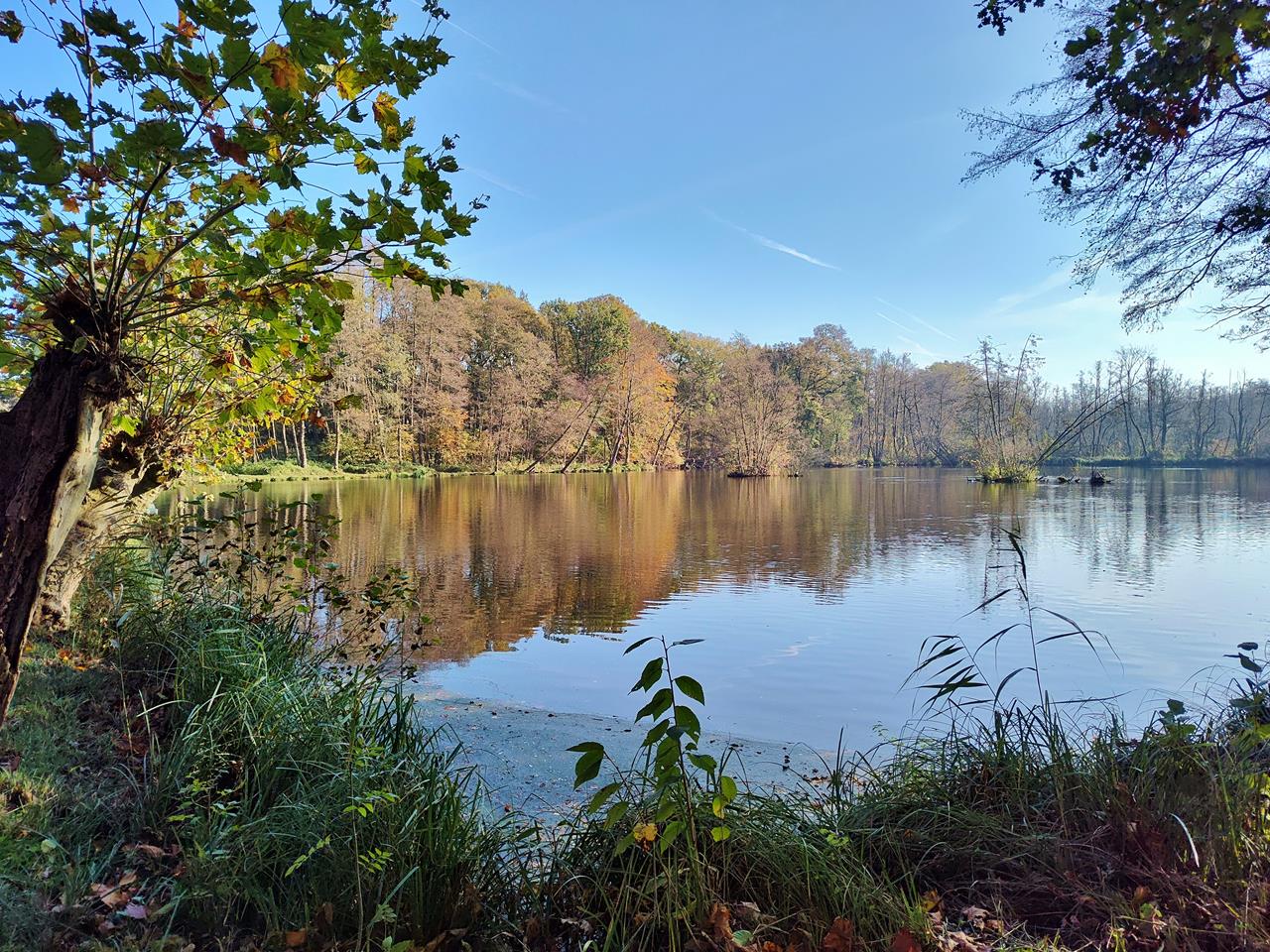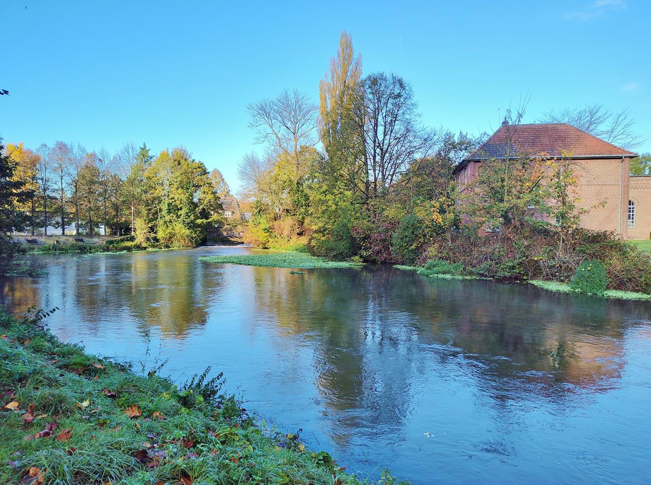 Im Schlosspark leuchten uns einige große Bäume wunderschön gelb, orange und rot entgegen. Doch viel Laub ist auch bereits zu Boden gegangen. Wir folgen der Niers vom Schlosspark in nordöstlicher Richtung durch die feuchte Niederung Wetschewell nach Güdderath.