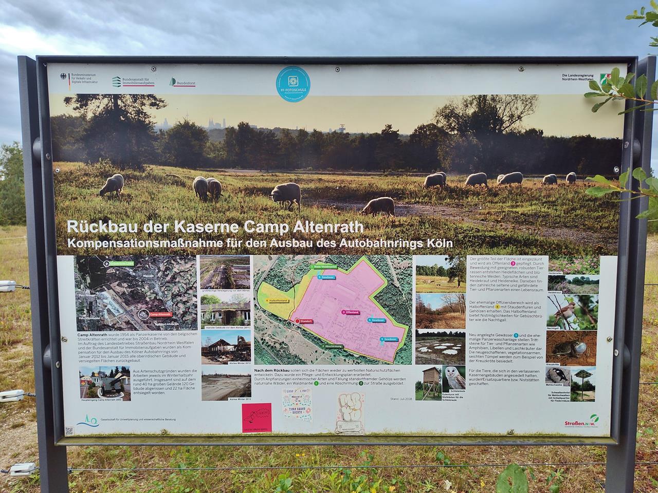 Wir starten am ehemaligen Camp Altenrath, wo die Belgischen Streitkräfte bis zur Deutschen Wiedervereinigung eine große Kaserne unterhielten. Als Ausgleichsfläche für die Erweiterung des Kölner Autobahnrings wurde das Gelände ab 2006 geschleift und renaturiert.