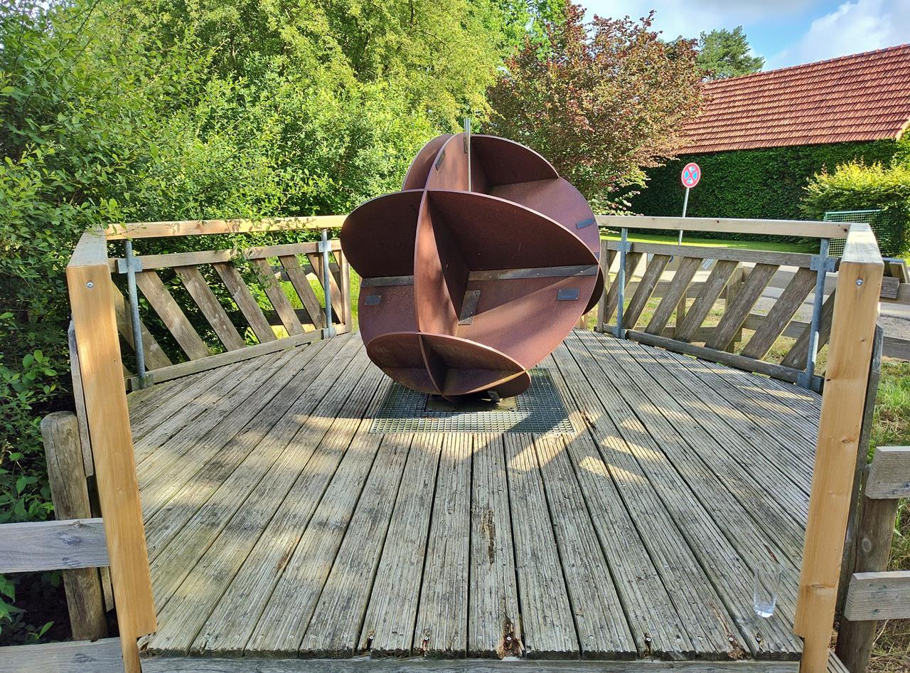 Der Punkt ist zum Kult geworden, seit die Dorfgemeinschaft Preußisch Ströhen dort in Eigenleistung ein kleines Haus zum Feiern errichtet hat. Daneben wurde über dem alten Grenzstein eine Skulptur errichtet und eine Marmortafel in Form des NRW-Umrisses aufgestellt. Jahrhundertelang war man hier praktisch im Nichts, jetzt befindet man sich an einem Ort von beinahe weltpolitischer Bedeutung 😉