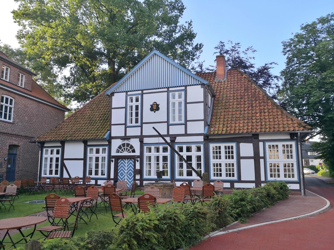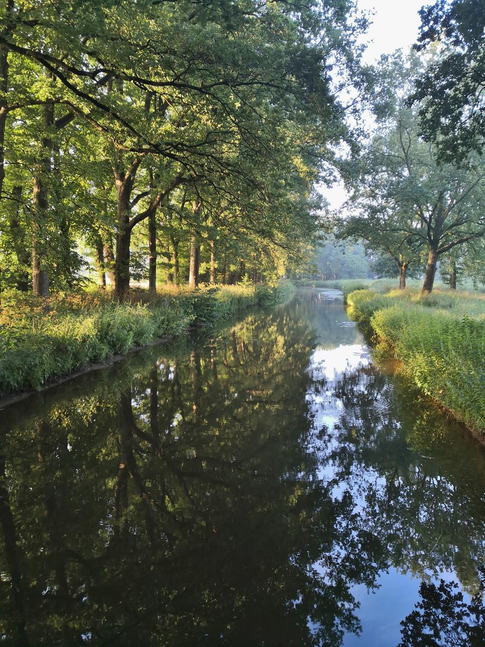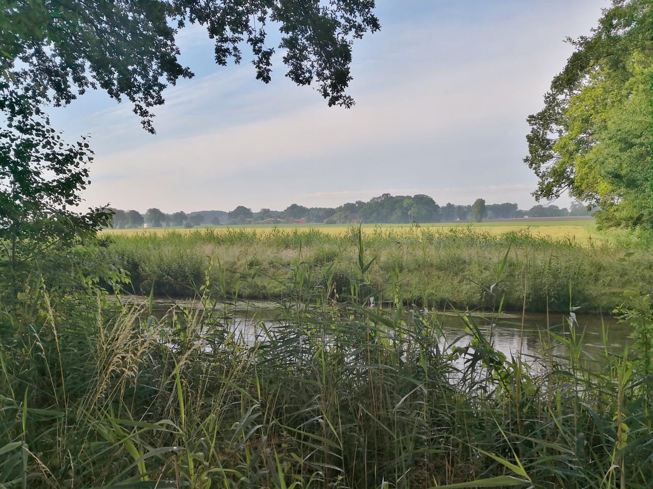 Nach einer wunderbar ruhigen Nacht am Ortsrand von Quakenbrück mitten in der Natur an der Hase beginnt der Tag mit Sonnenschein. Bevor ich weiterfahre, laufe ich mit Doxi zunächst zwei Kilometer durch eine schöne Eichenallee an der Hase entlang in das Zentrum des Ortes.