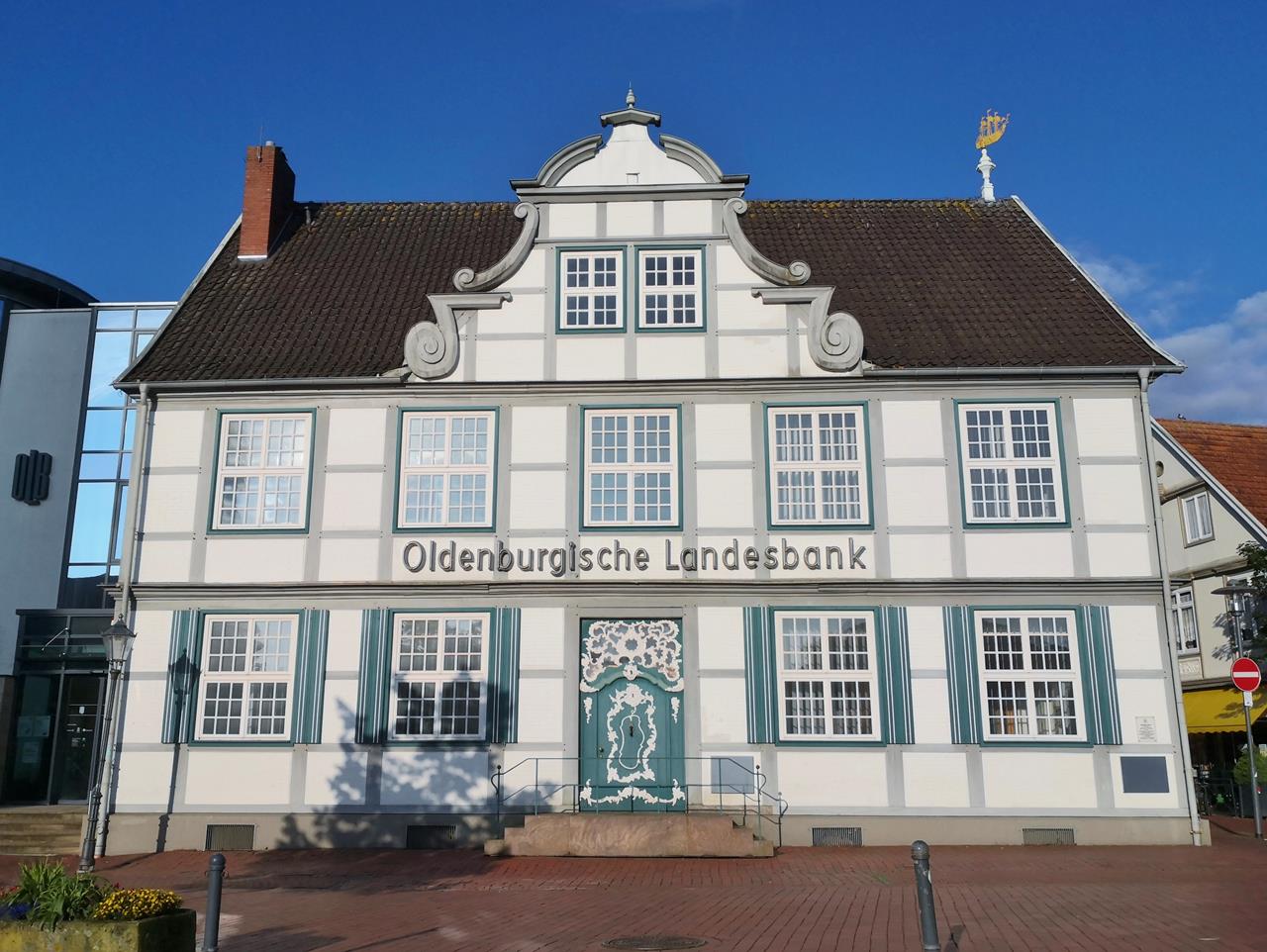 Blick zwischen den Häusern hindurch zur ev. Silvesterkirche von Quakenbrück