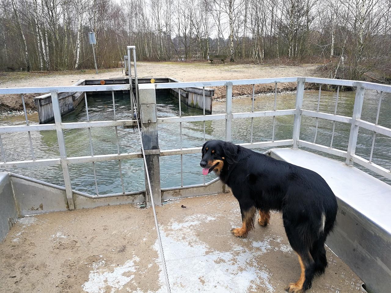 Vor allem, wenn man allein ist und die Fähre erst einmal vom anderen Ufer heranholen muss. Doxi war der ganze Bootstransfer nicht so geheuer, doch sie wurde nicht wirklich gefragt. Dafür musste sie aber auch nicht kurbeln.