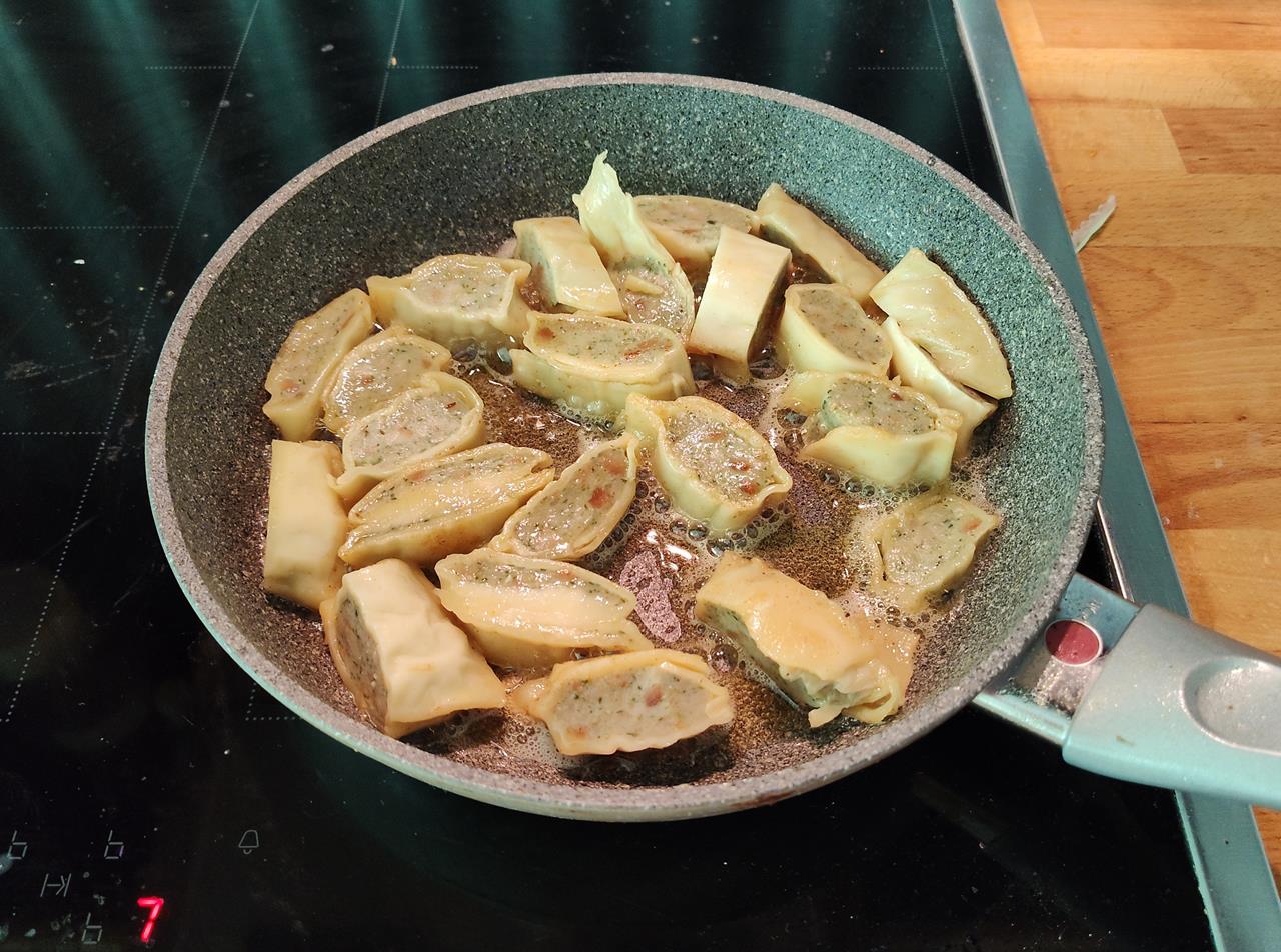 Die Grundlagen bilden Maultauschen, die ich in Streifen schneide und in der Pfanne mit ordentlich Butter von allen Seiten anbrate. Kurz bevor die „Maulschellen“ goldbraun sind, gebe ich den Rest Pilze darüber, außerdem eine in kleine Würfel geschnittene Scheibe Leberkäse, die unbedingt mit verarbeitet werden wollte.