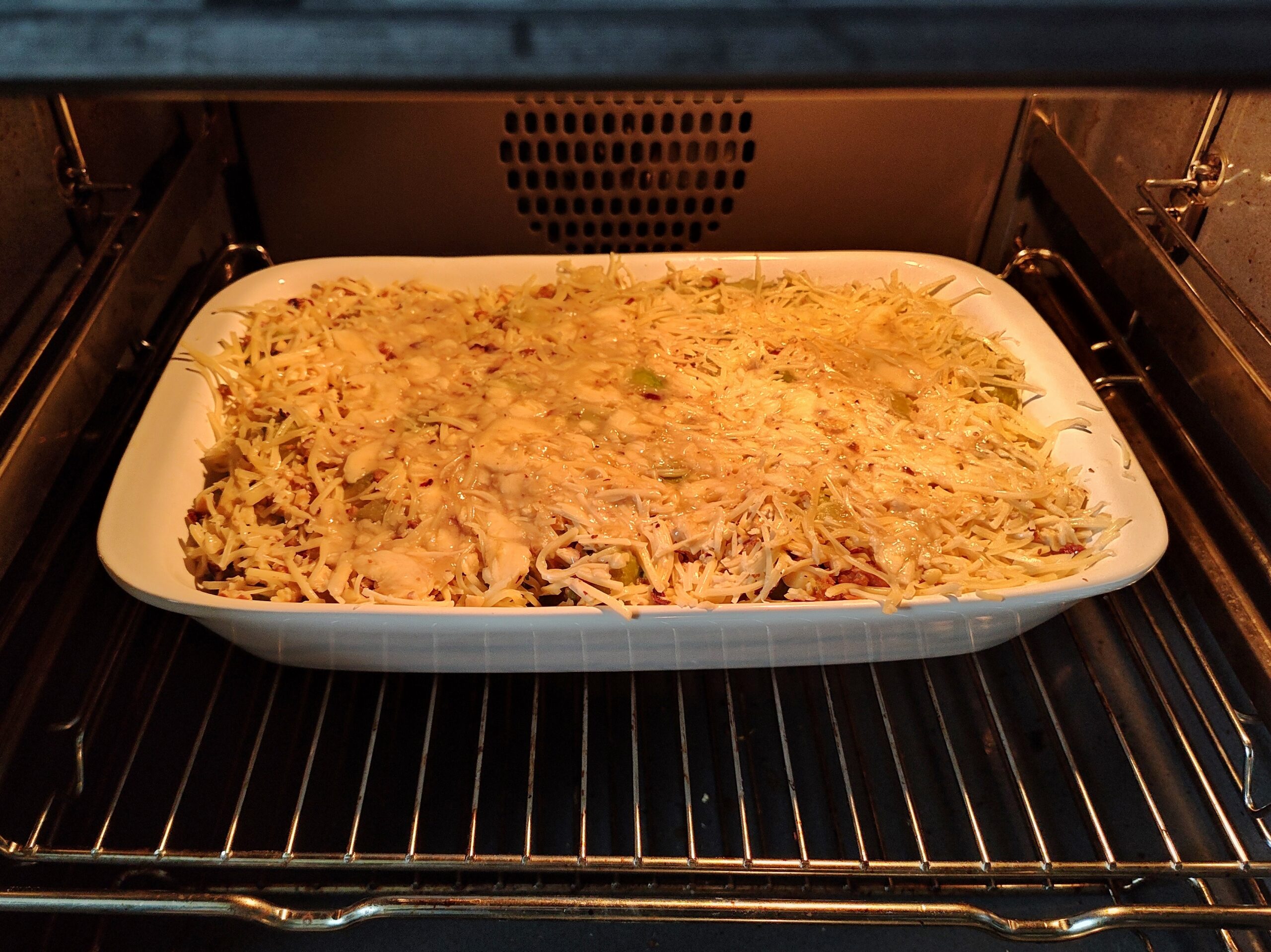 Und als Sauße bzw. zum Überbacken wird obenauf eine Mischung aus Schmand, Milch, Emmentaler Reibekäse, sowie gehackten Nüssen und zerstoßener Banane gegeben. Das ganze natürlich ordentlich mit Salz und Pfeffer gewürzt.