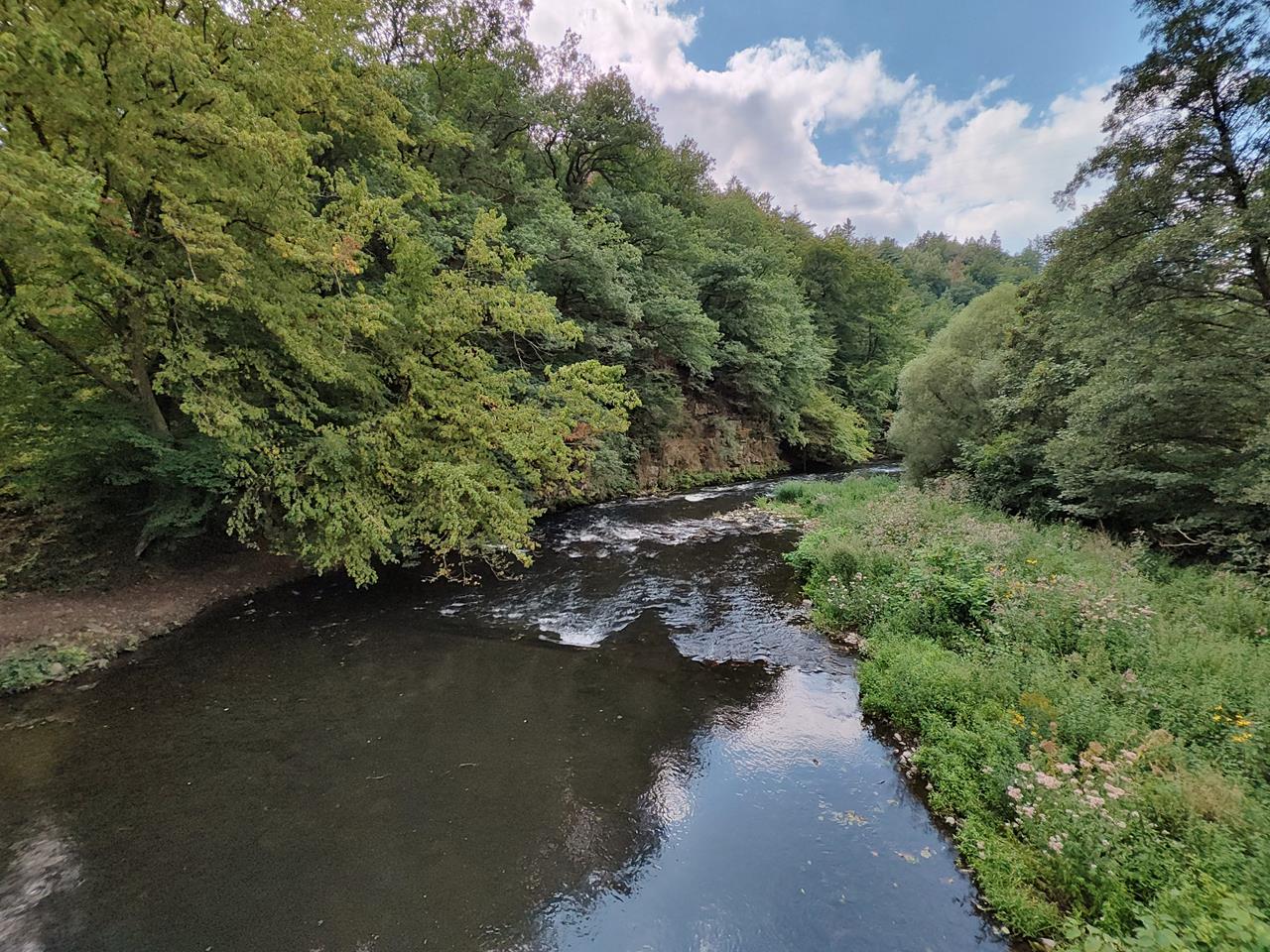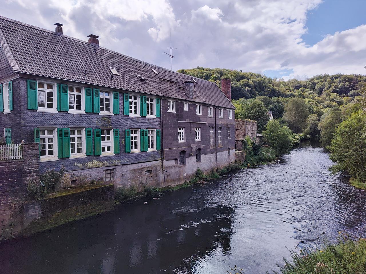 Wir sind rund um Alt-Beyenburg zwischen Wuppertal und Radevormwald auf einer 14 km langen Runde mit reichlich Höhenmetern und mehreren sportlichen Anstiegen unterwegs.Im Wald ist alles grün, die Wiesen sind saftig und die Wege dazwischen teilweise vermatscht. Im Hochsommer ist das ja sonst eher selten der Fall, aber auch hier hat der viele Regen im Juli und August Spuren hinterlassen.
